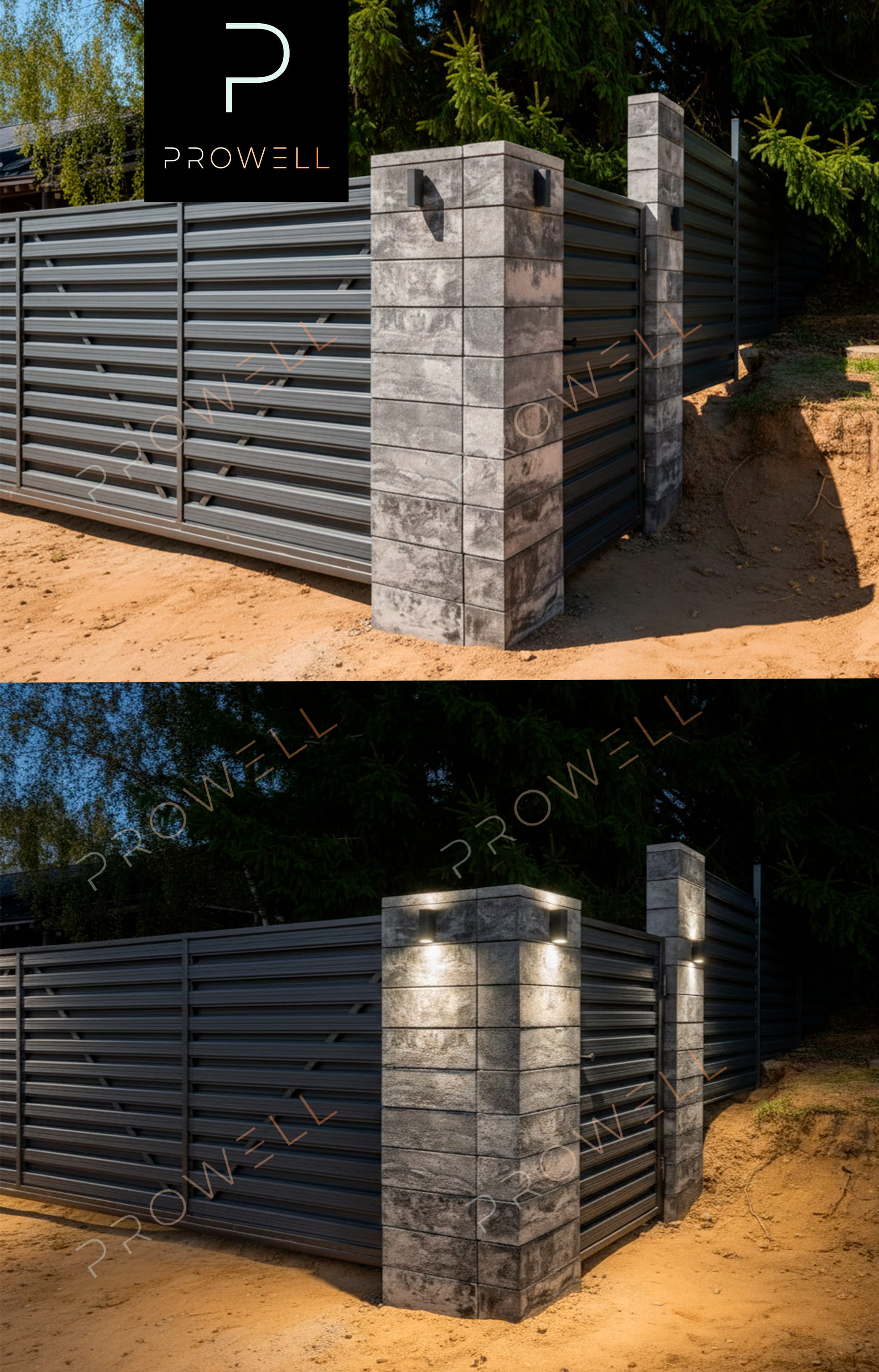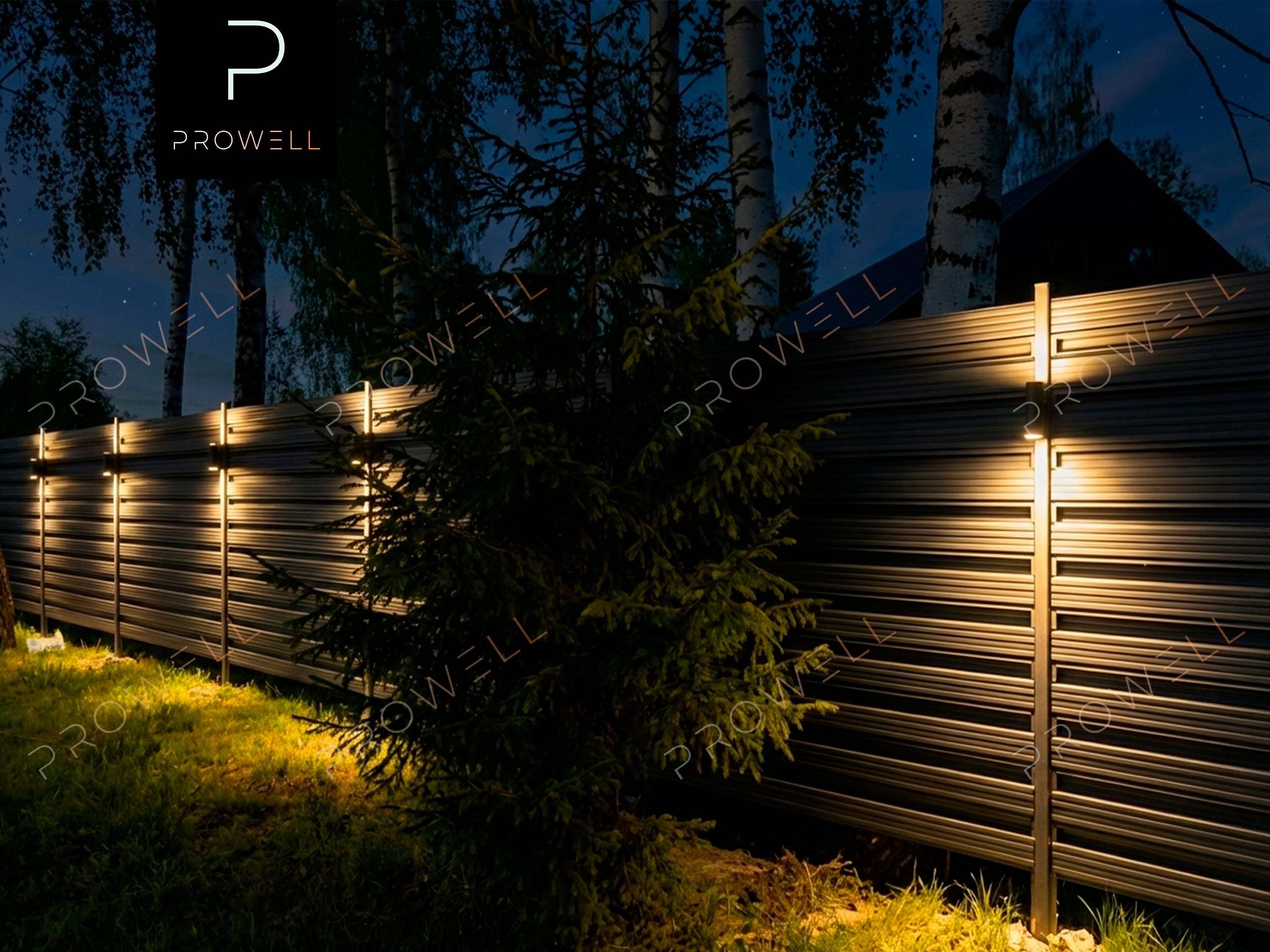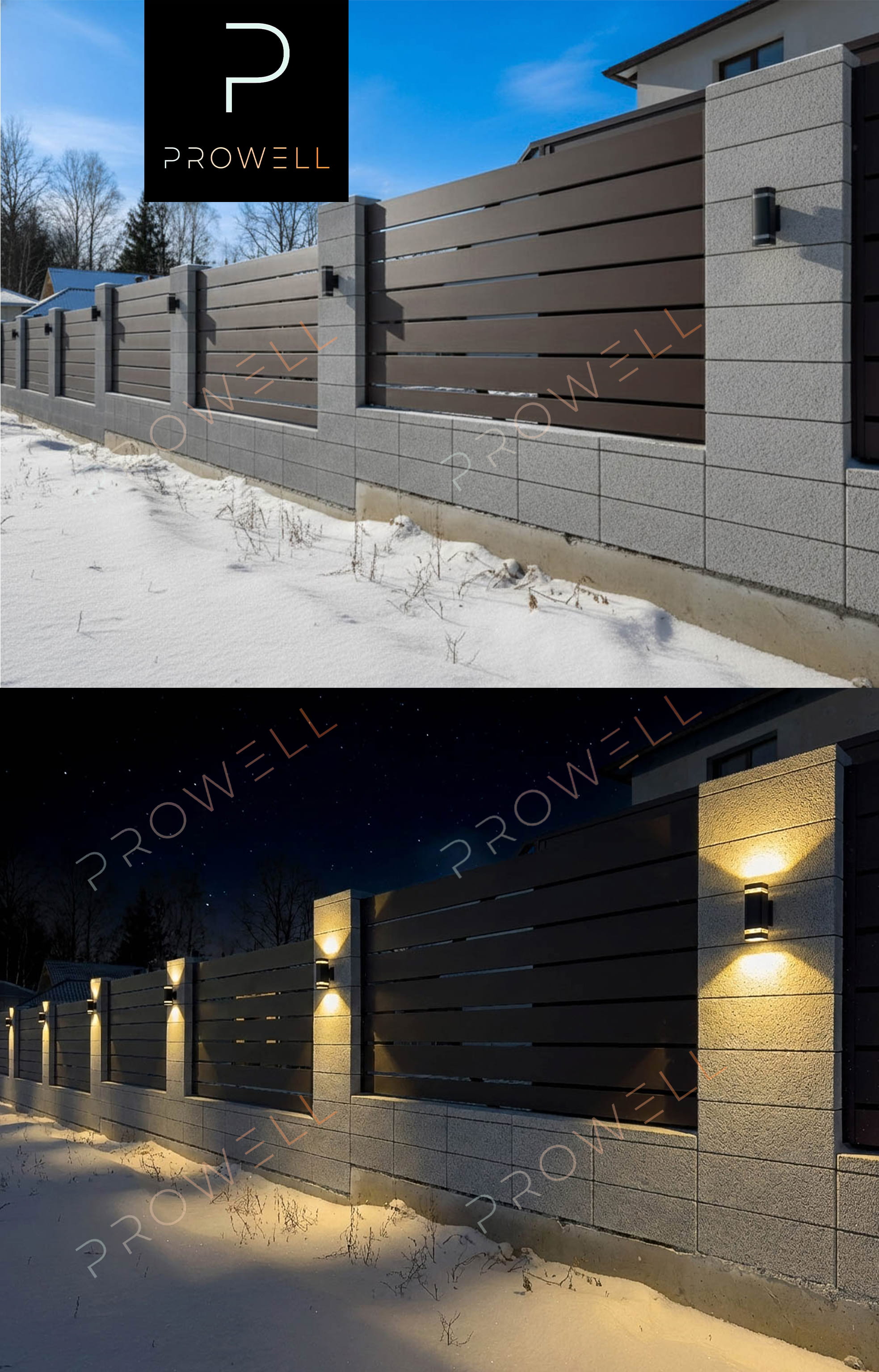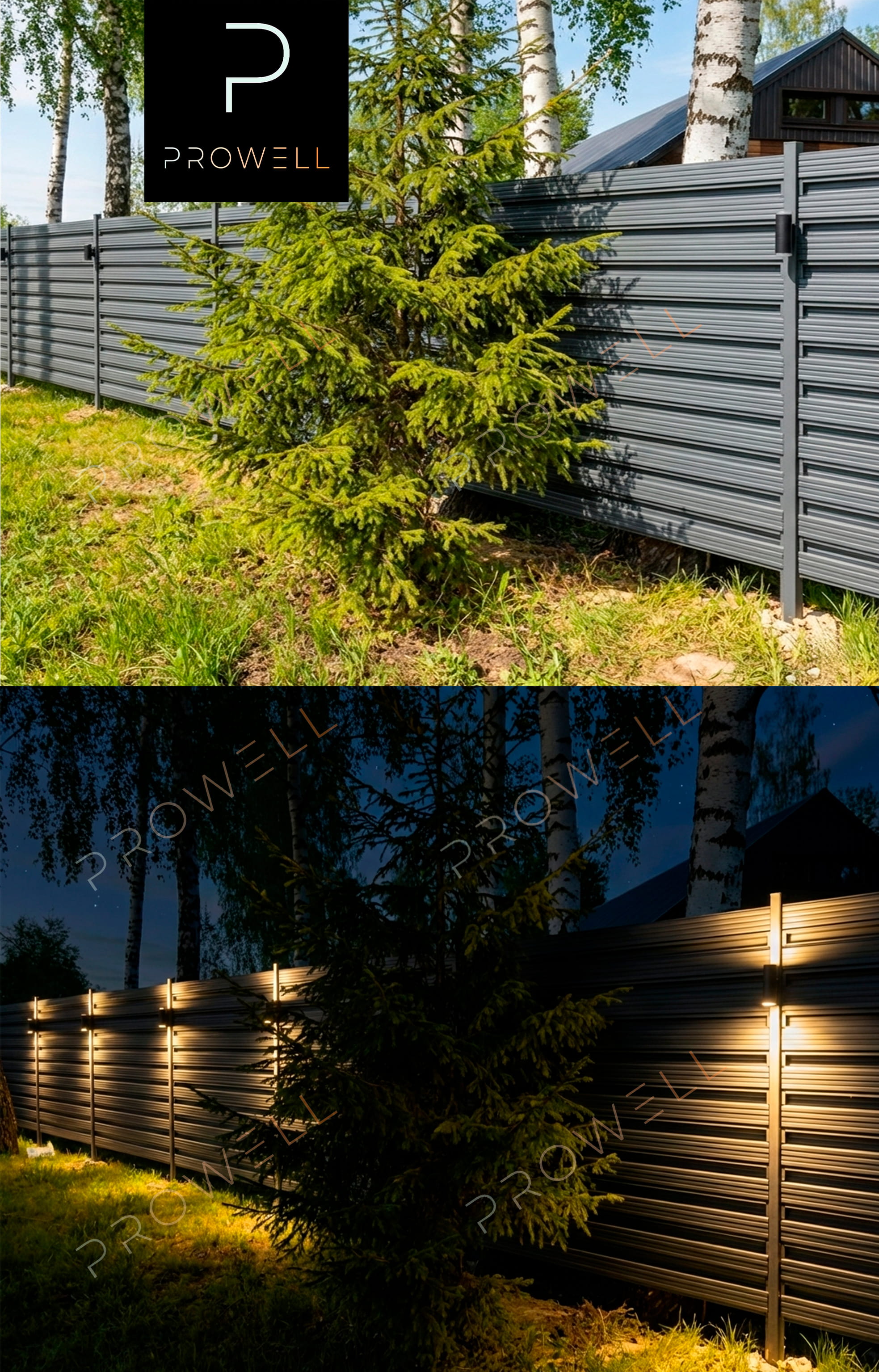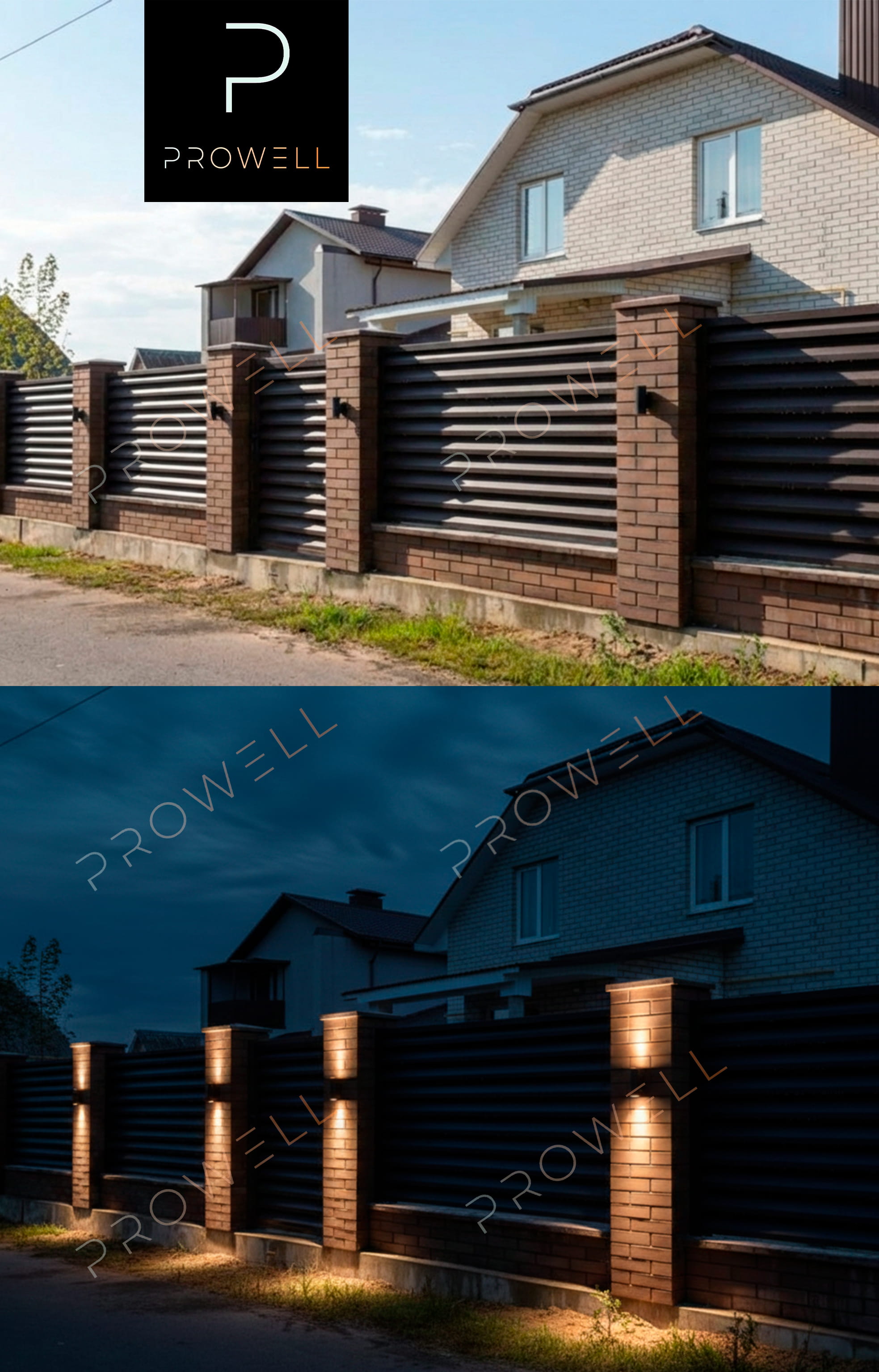 «Современное решение для вашего участка: стильный забор с комбинированной подсветкой. На фото продемонстрирована функциональность системы — днем забор обеспечивает эстетичный внешний вид и приватность, а с наступлением темноты настенные фонари создают уютную атмосферу и обеспечивают безопасность»