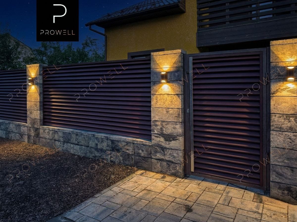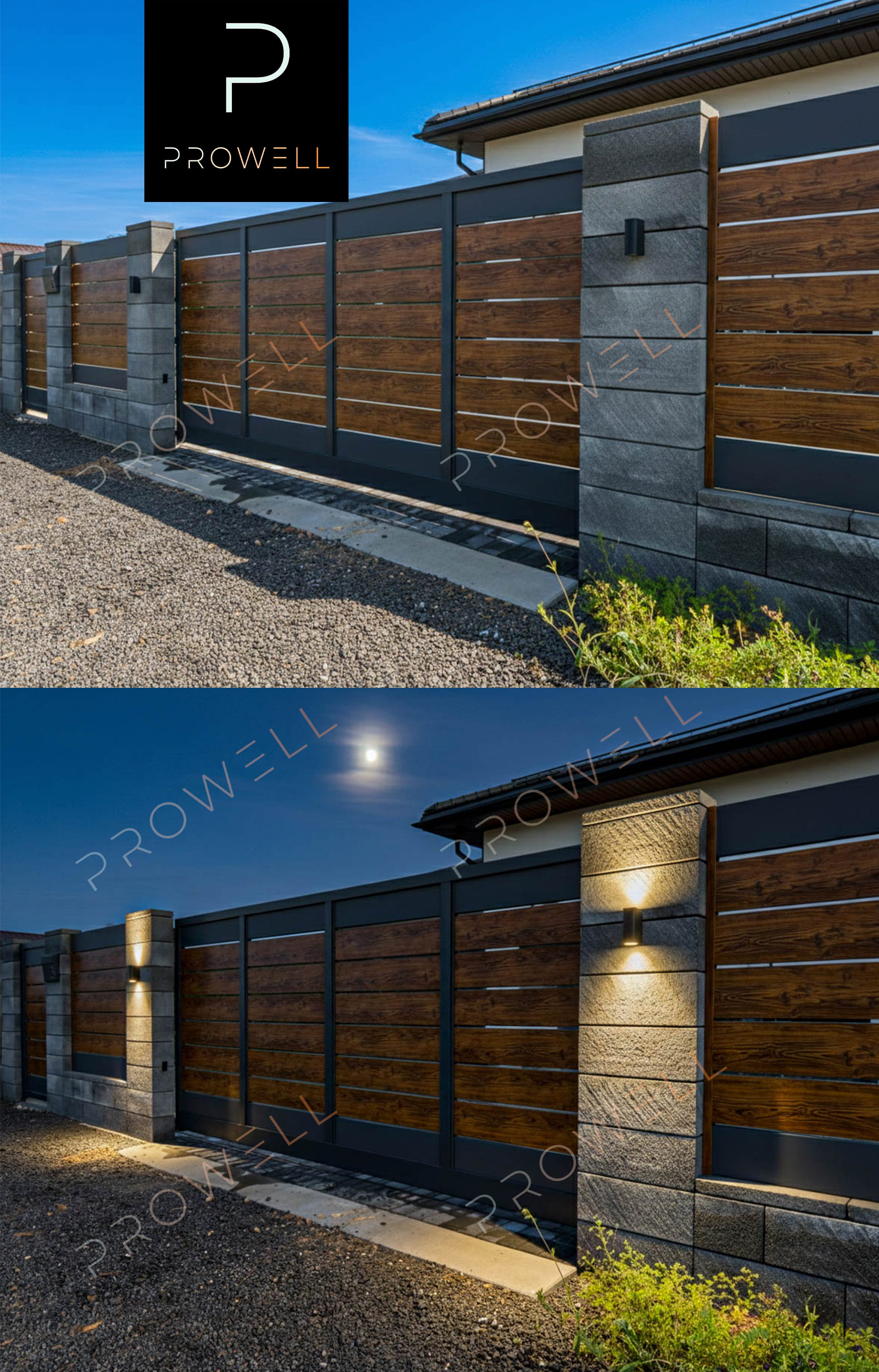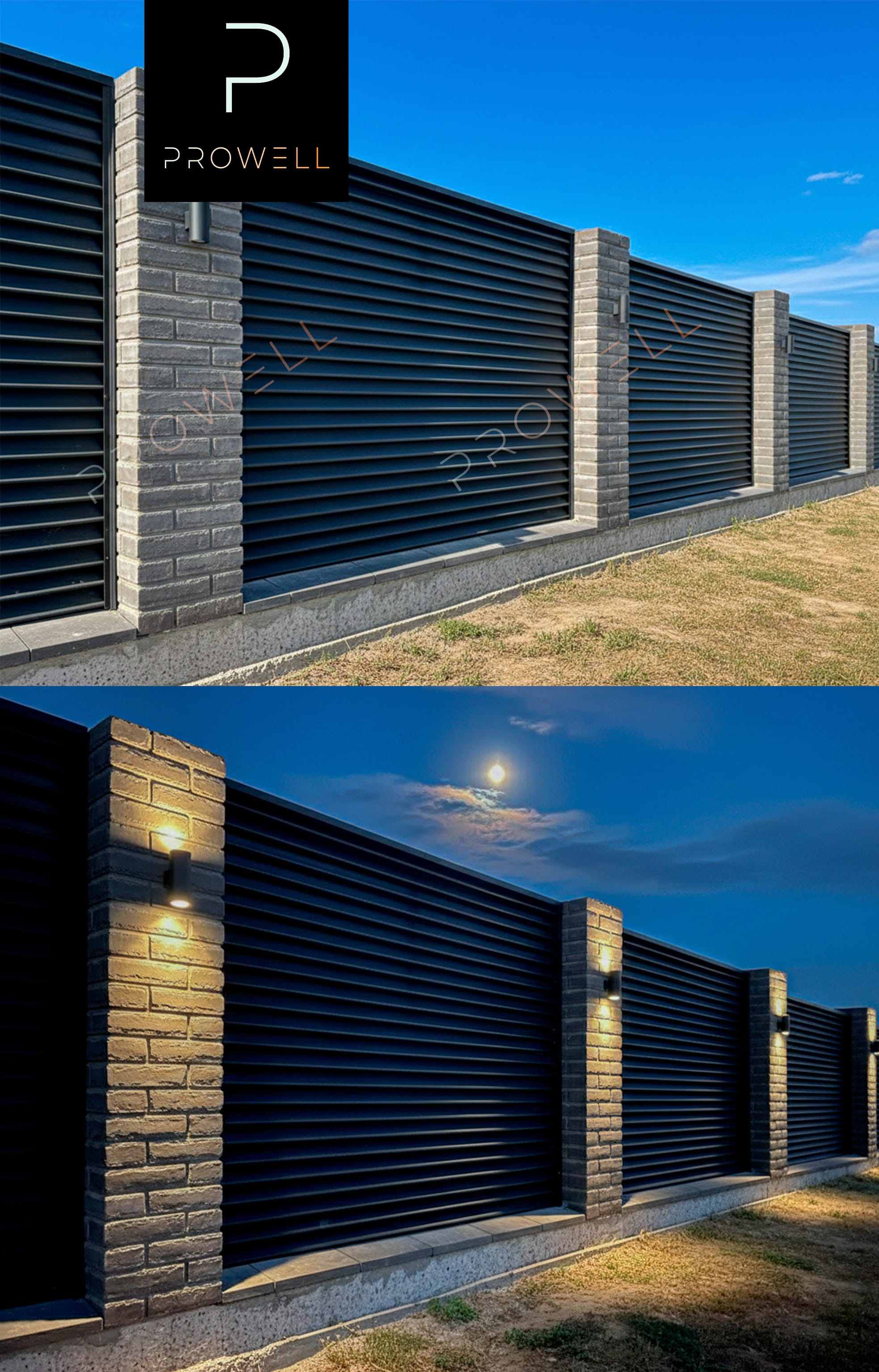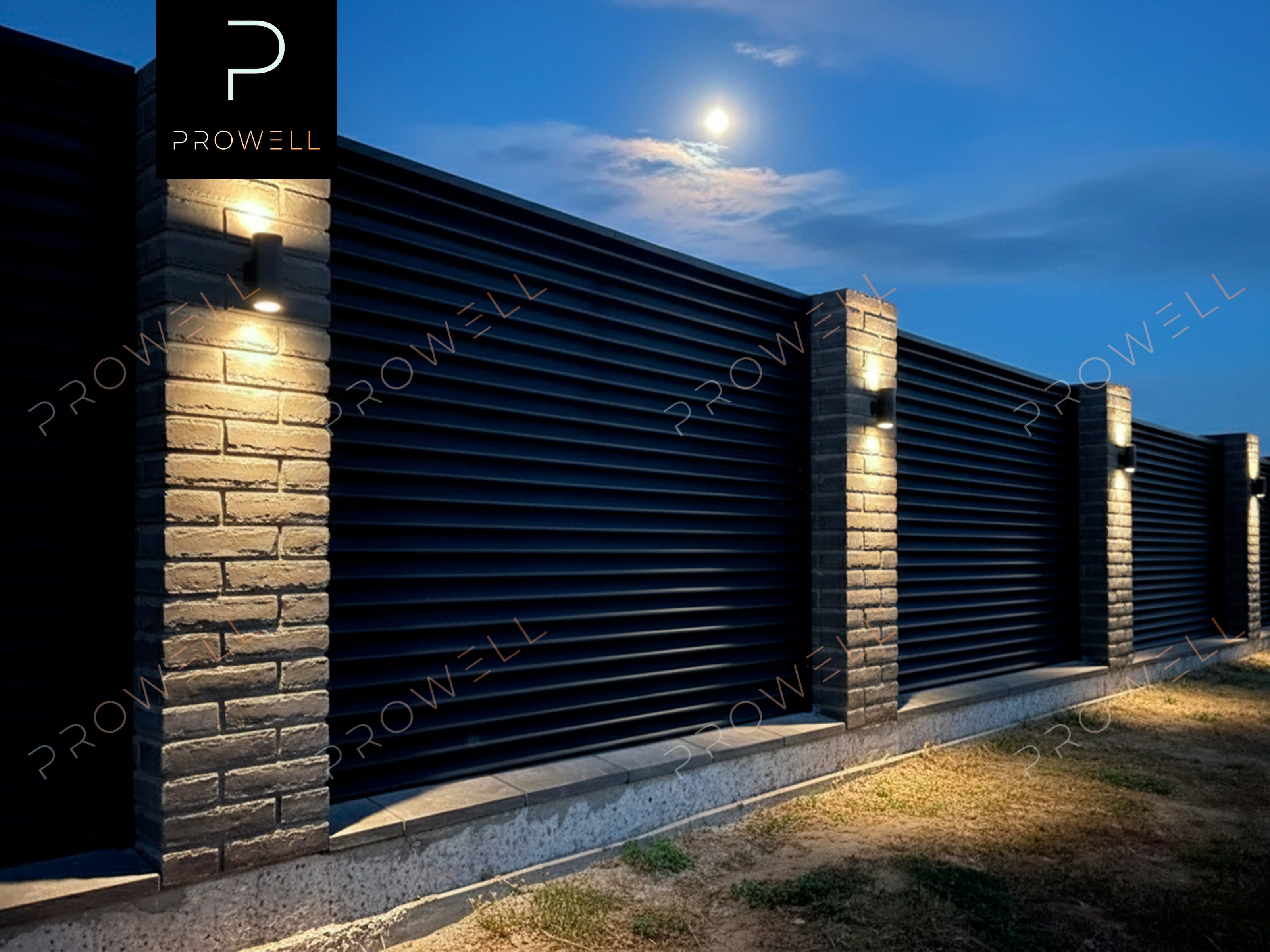 «Современное решение для вашего участка: стильный забор с комбинированной подсветкой. На фото продемонстрирована функциональность системы — днем забор обеспечивает эстетичный внешний вид и приватность, а с наступлением темноты настенные фонари создают уютную атмосферу и обеспечивают безопасность»