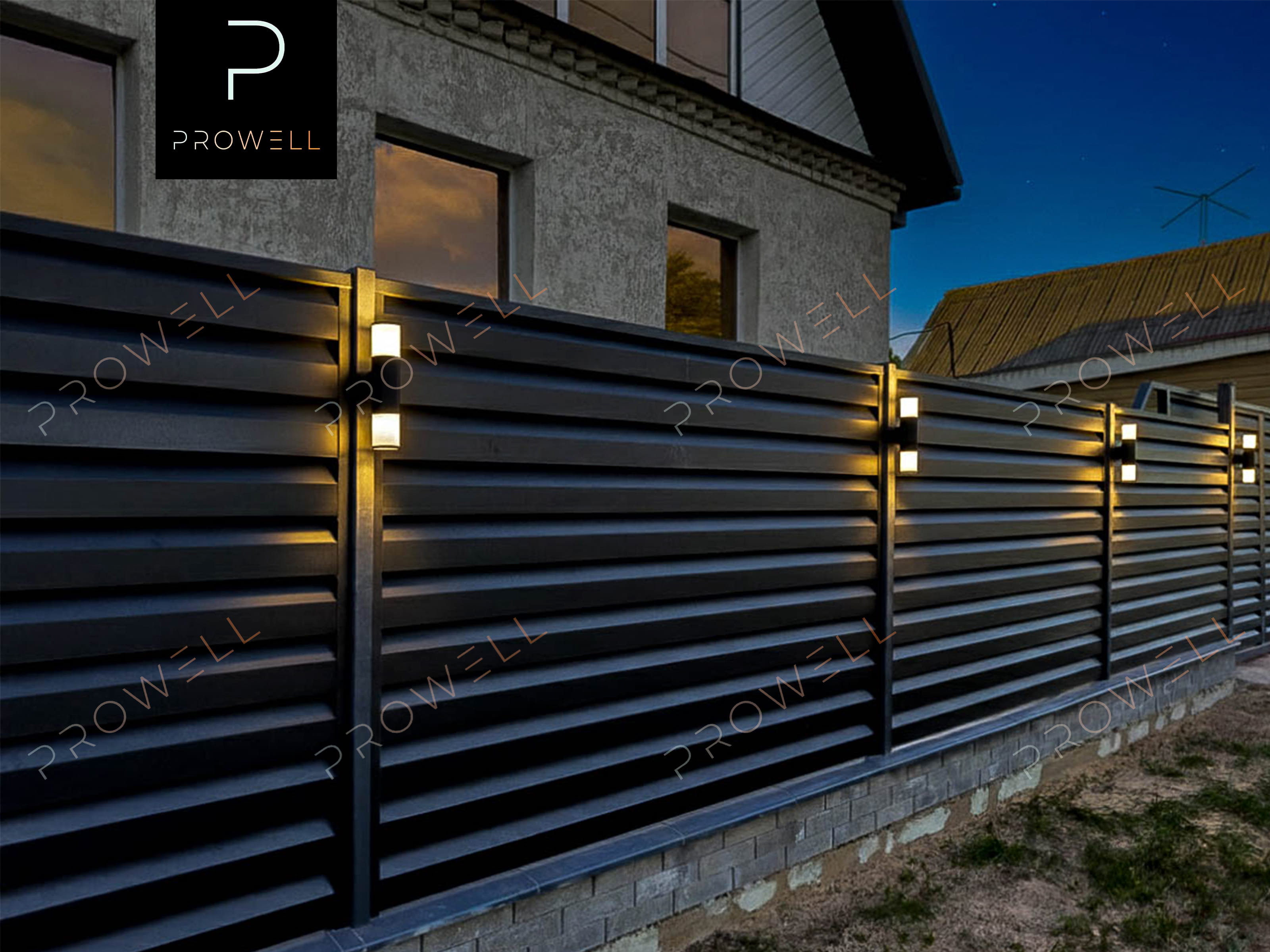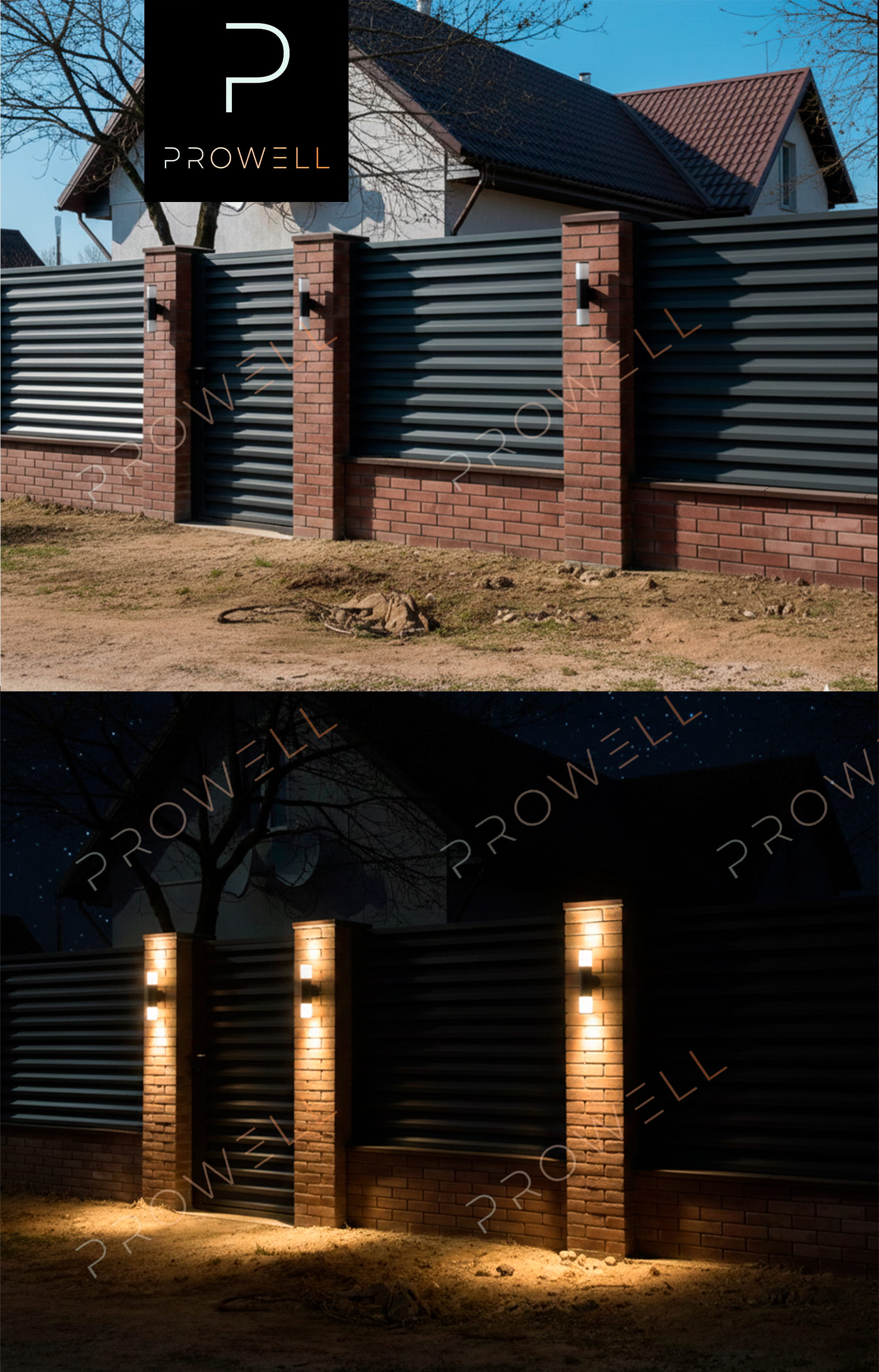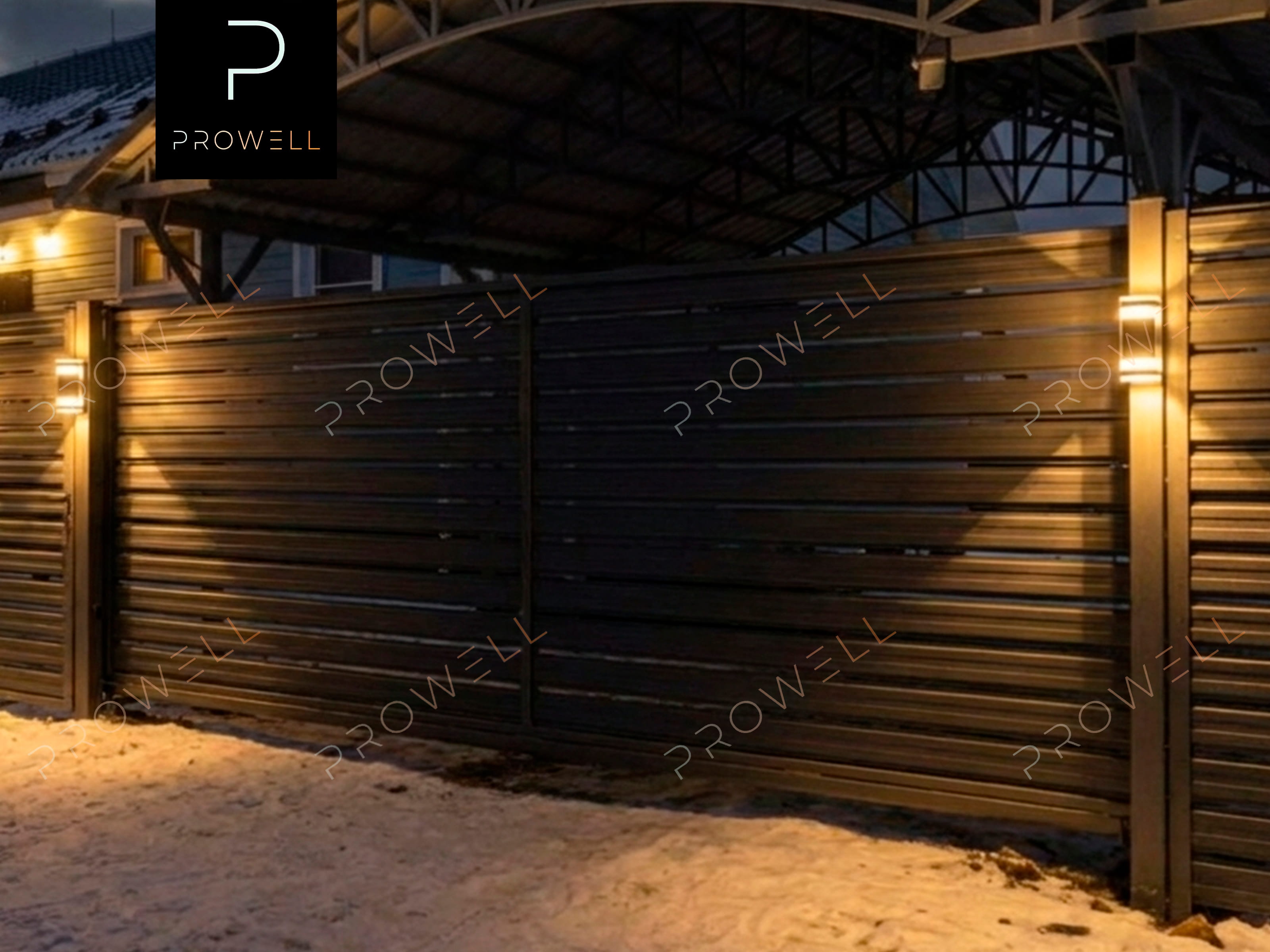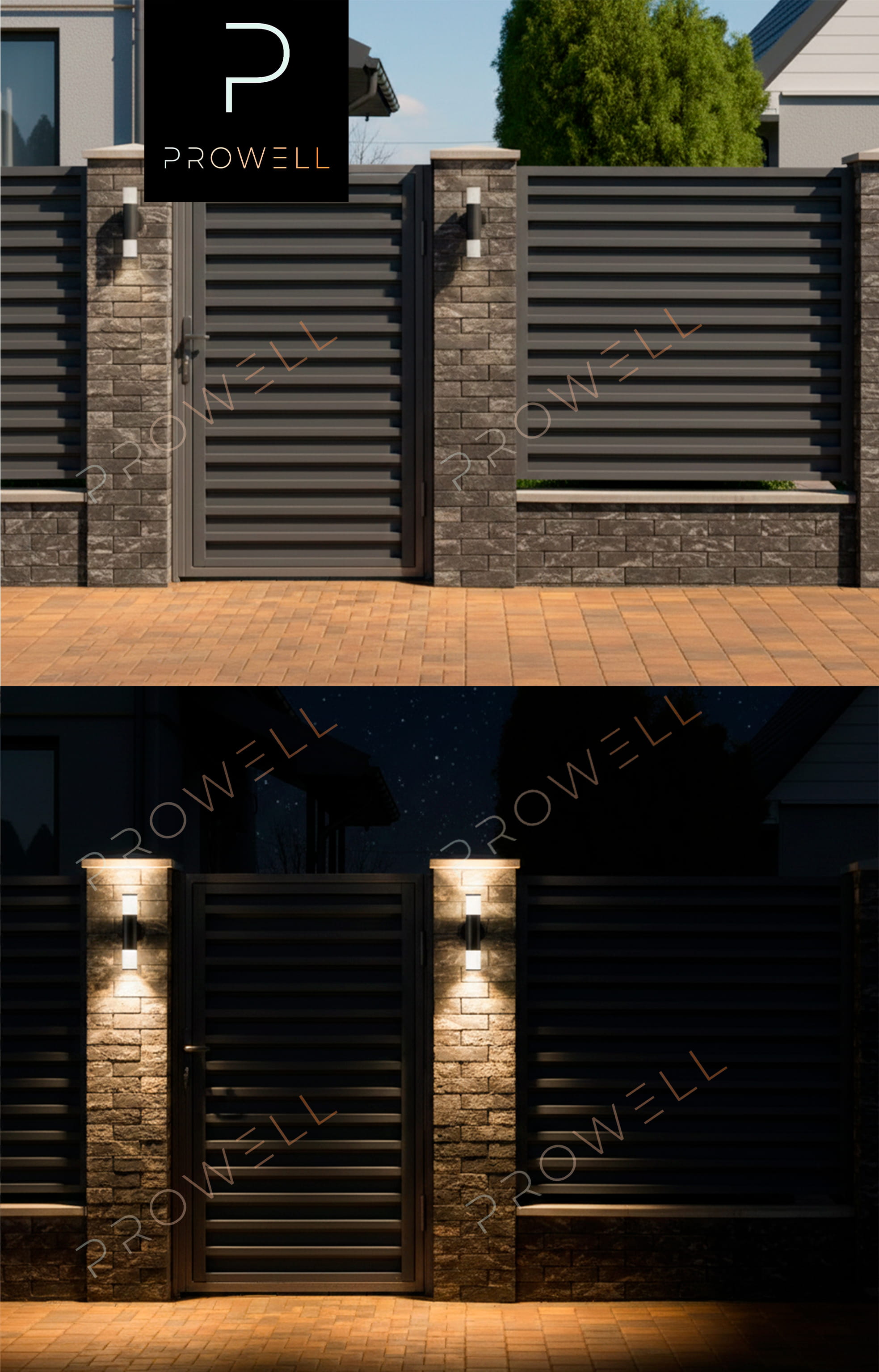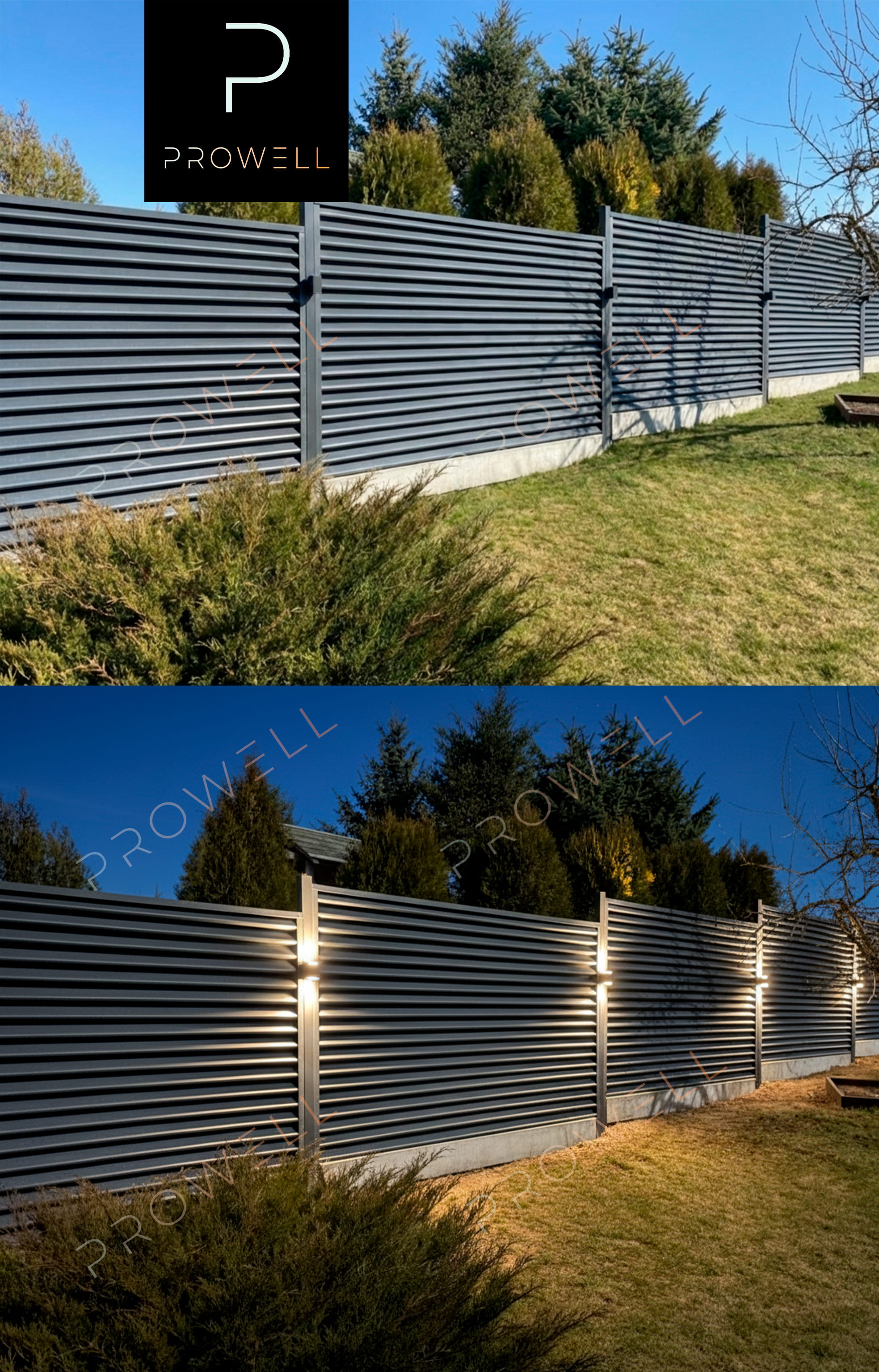 «Современное решение для вашего участка: стильный забор с комбинированной подсветкой. На фото продемонстрирована функциональность системы — днем забор обеспечивает эстетичный внешний вид и приватность, а с наступлением темноты настенные фонари создают уютную атмосферу и обеспечивают безопасность»