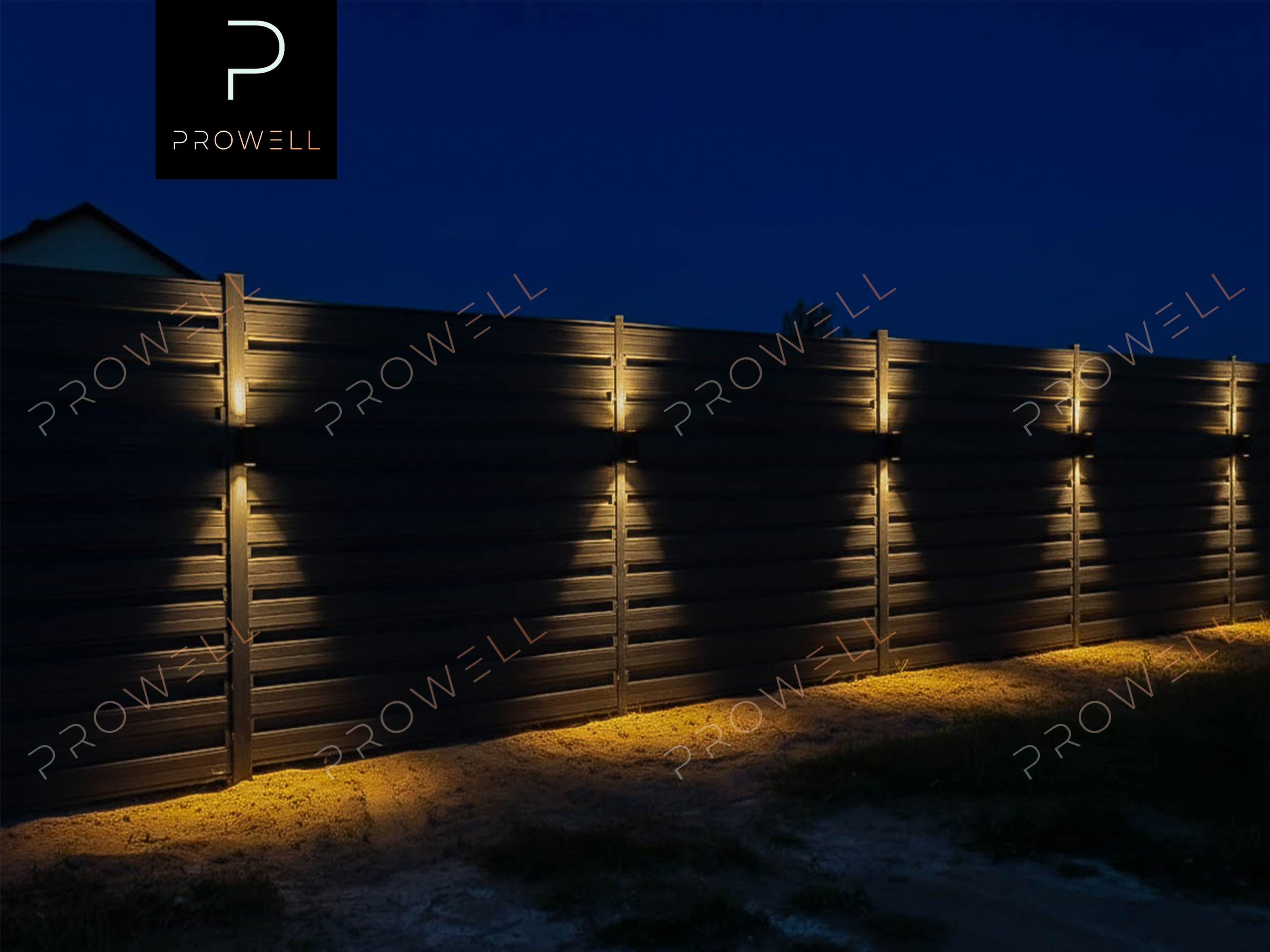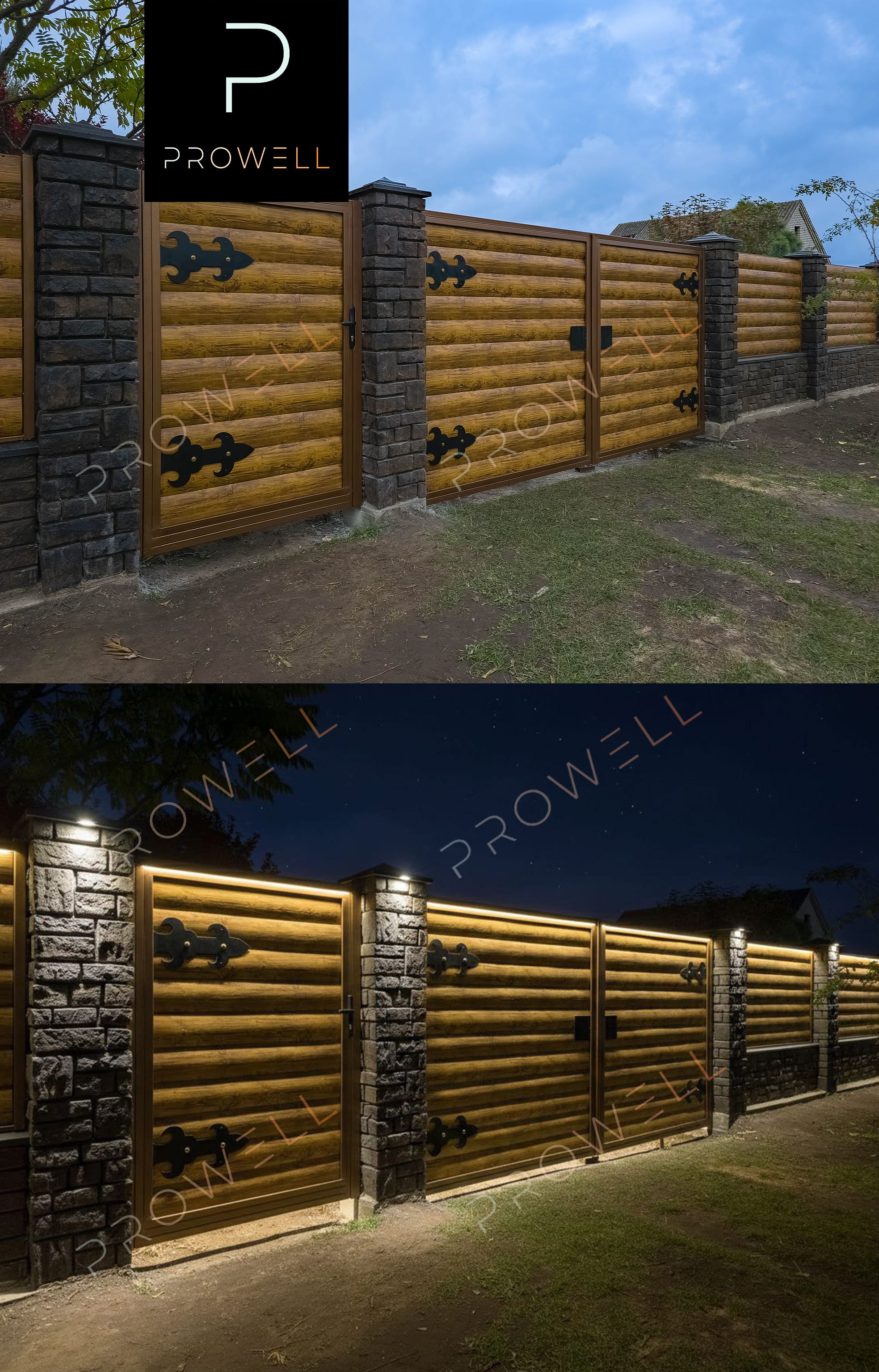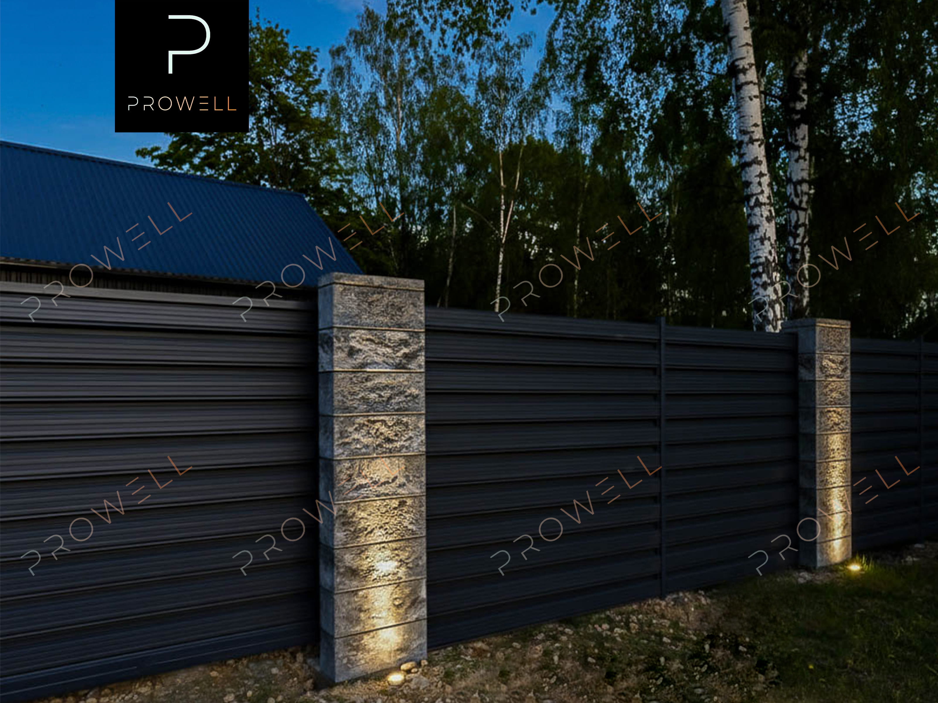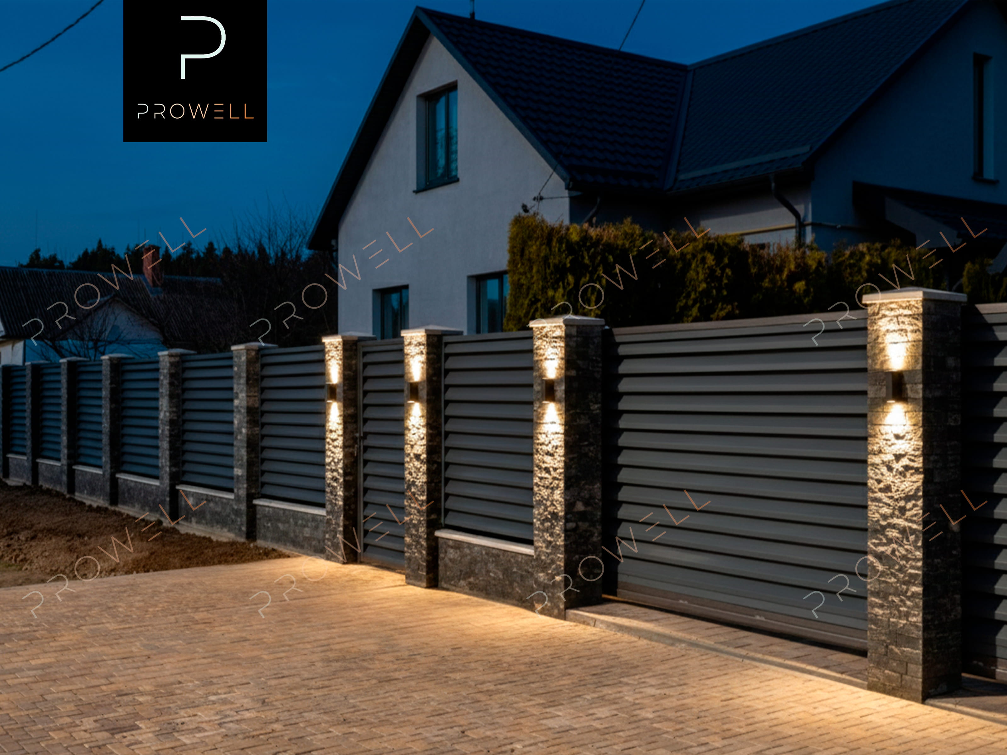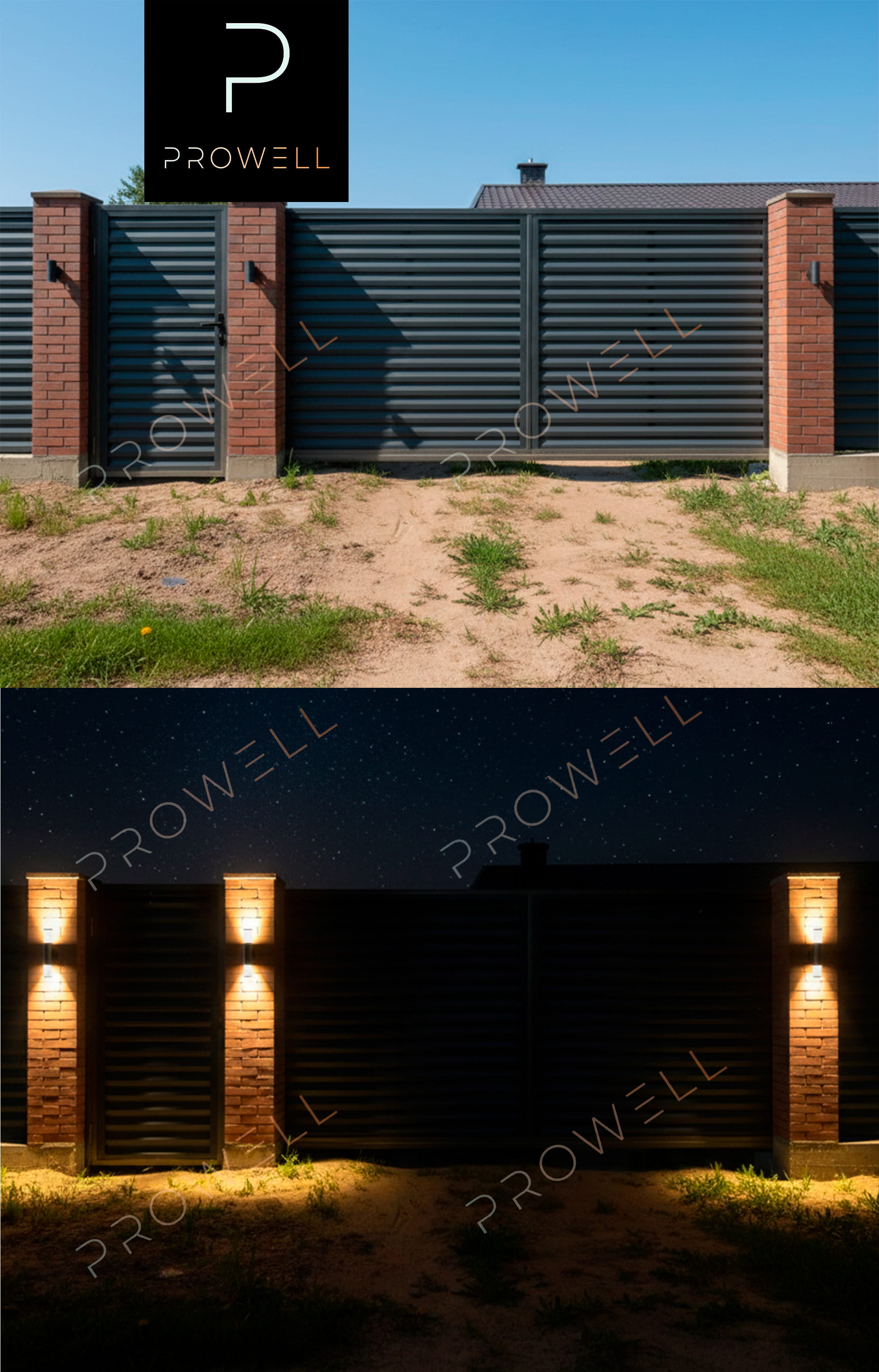 «Современное решение для вашего участка: стильный забор с комбинированной подсветкой. На фото продемонстрирована функциональность системы — днем забор обеспечивает эстетичный внешний вид и приватность, а с наступлением темноты настенные фонари создают уютную атмосферу и обеспечивают безопасность»