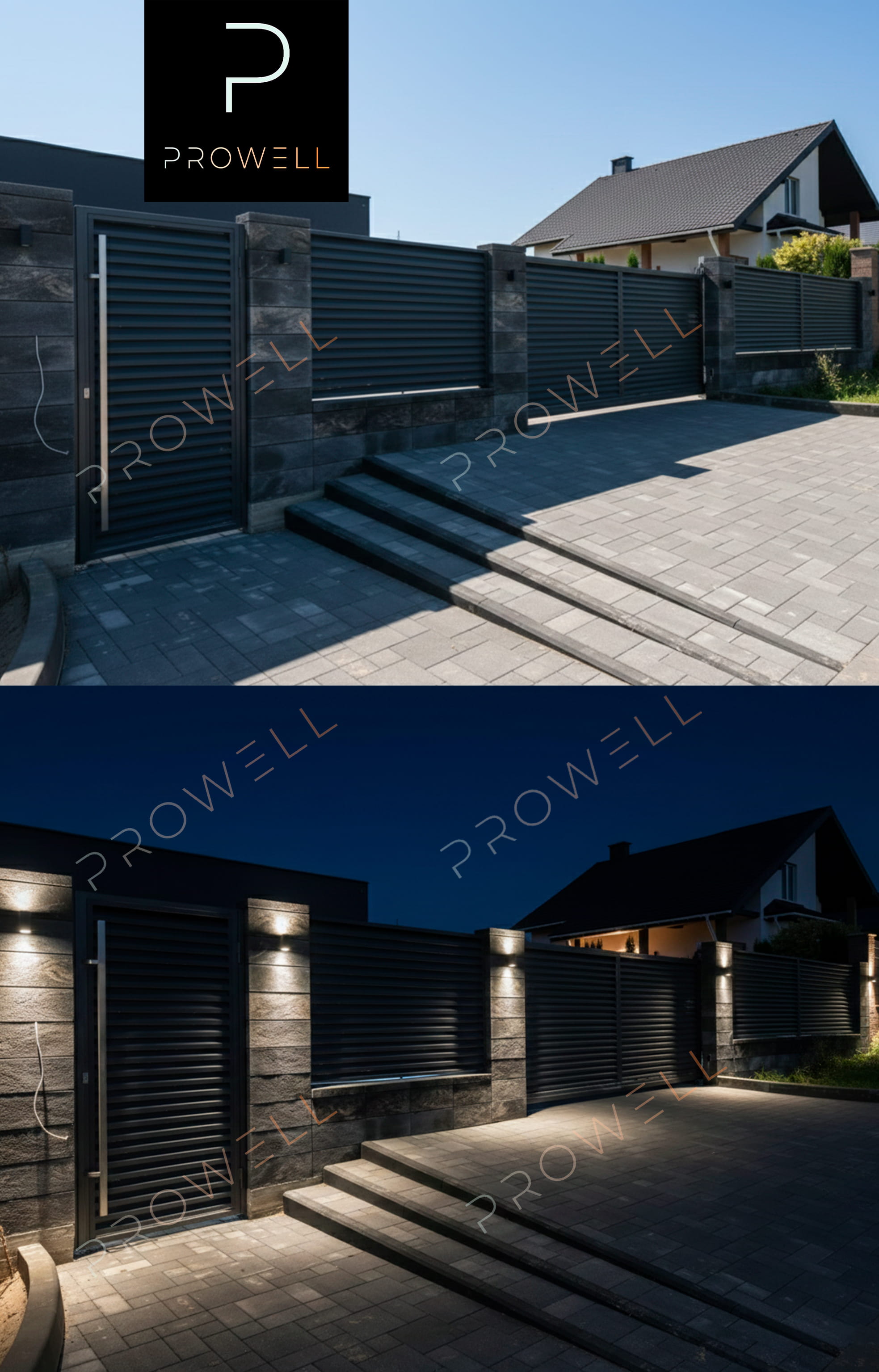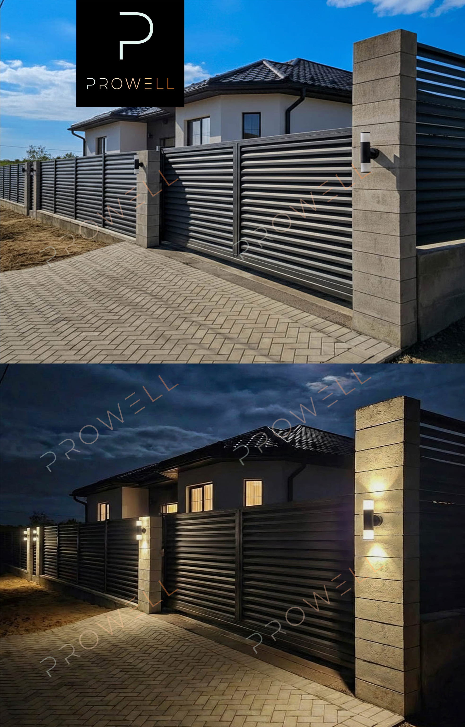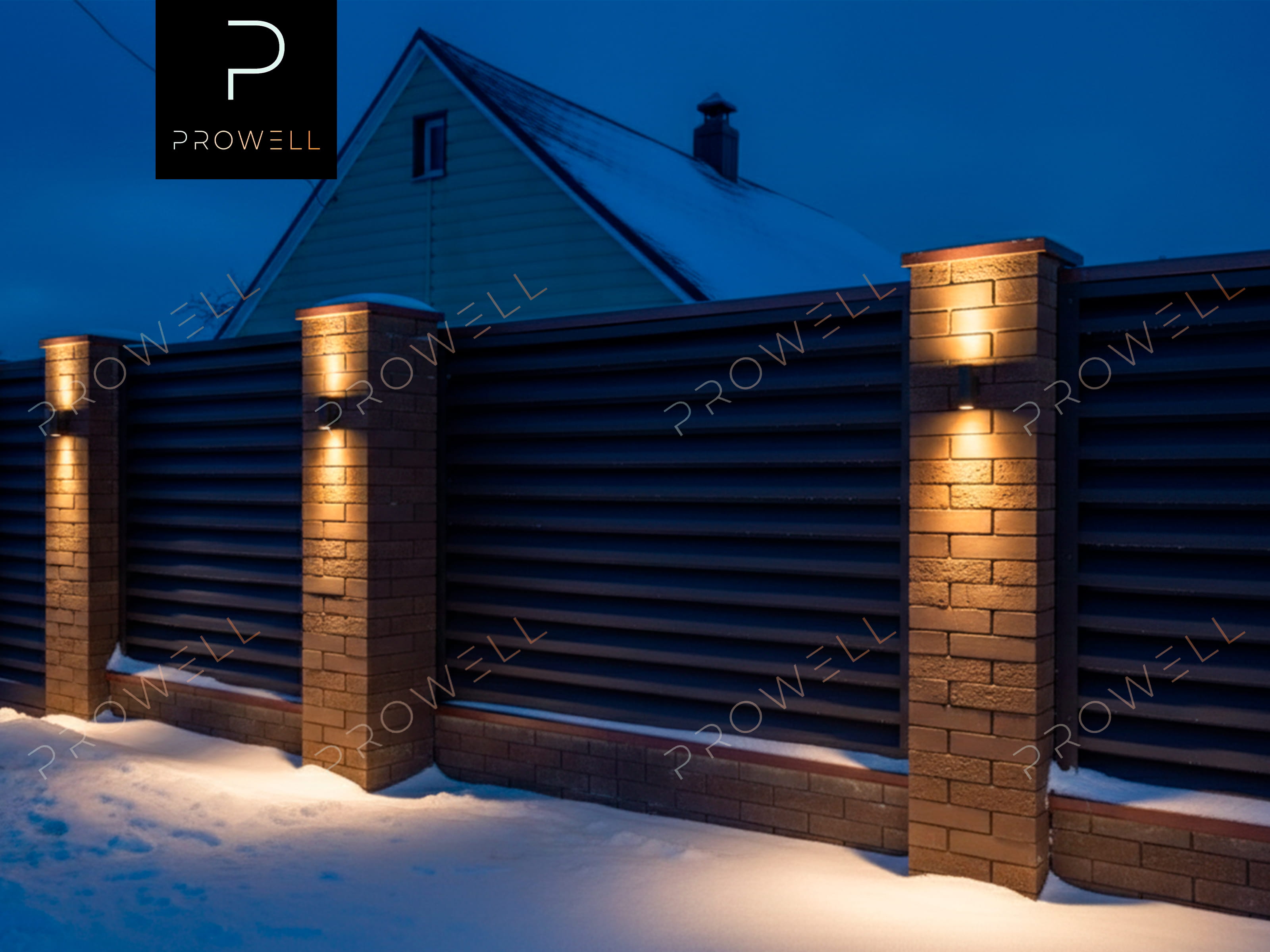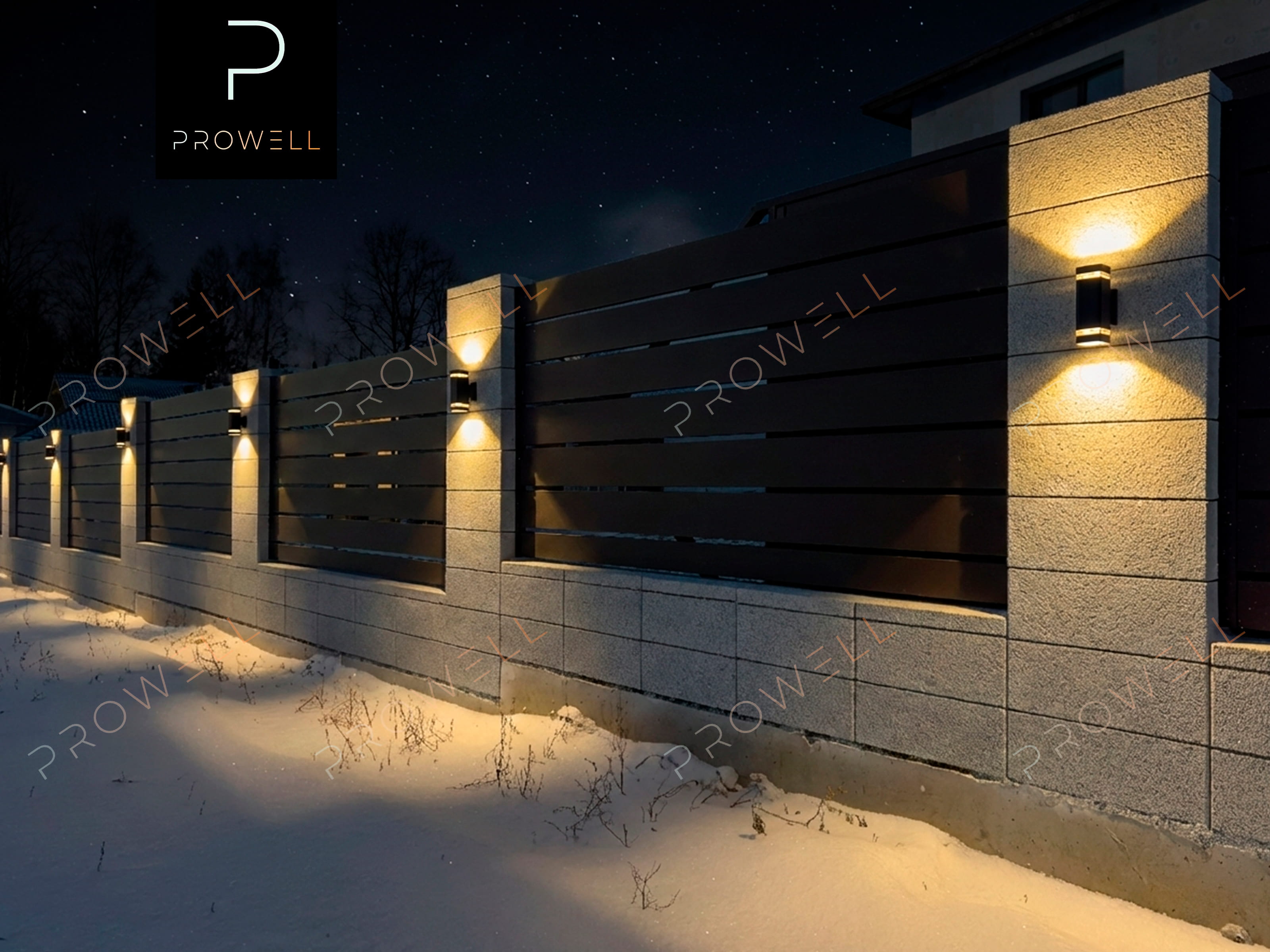 «Современное решение для вашего участка: стильный забор с комбинированной подсветкой. На фото продемонстрирована функциональность системы — днем забор обеспечивает эстетичный внешний вид и приватность, а с наступлением темноты настенные фонари создают уютную атмосферу и обеспечивают безопасность»