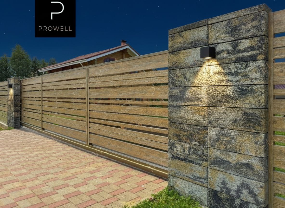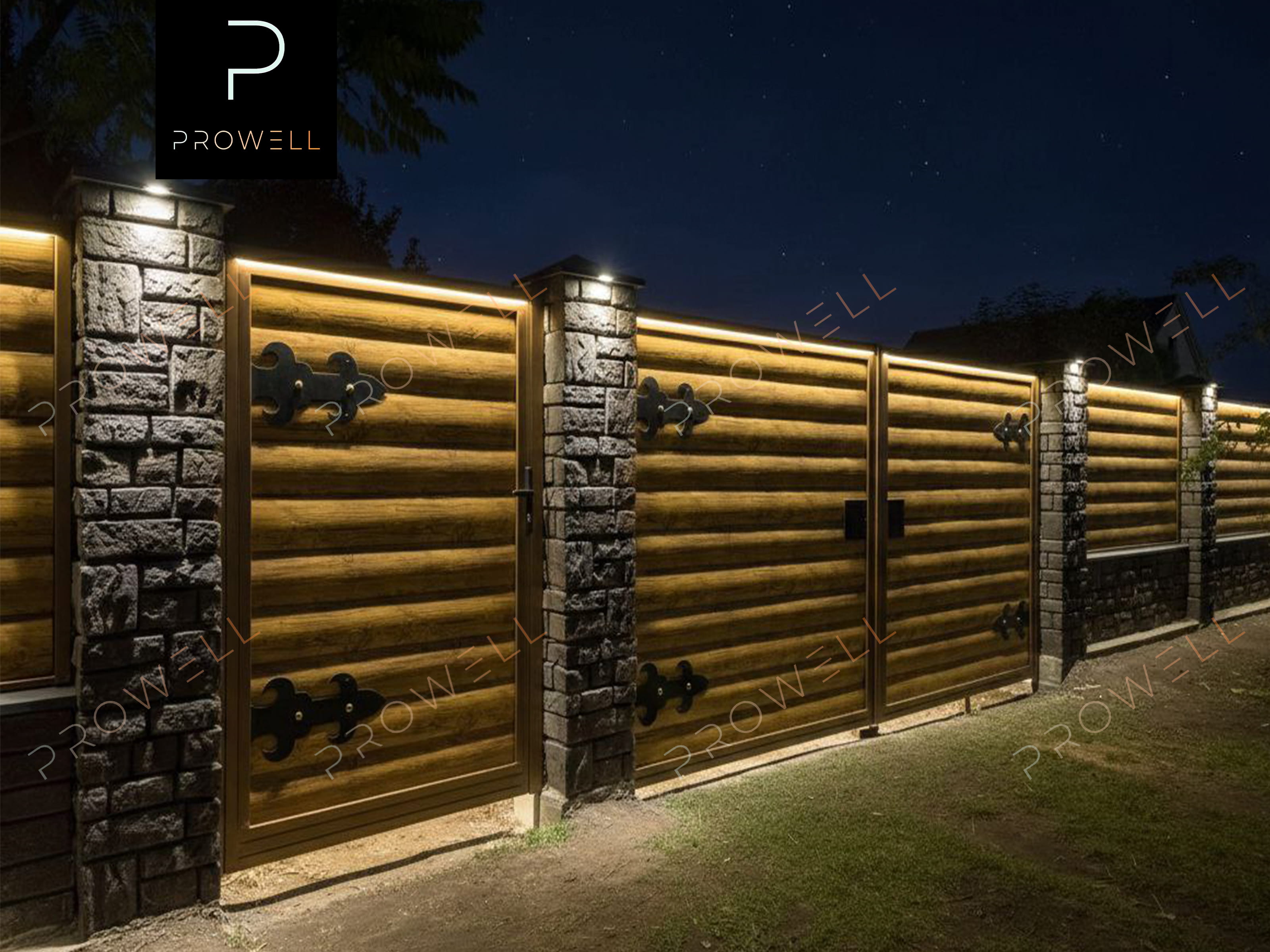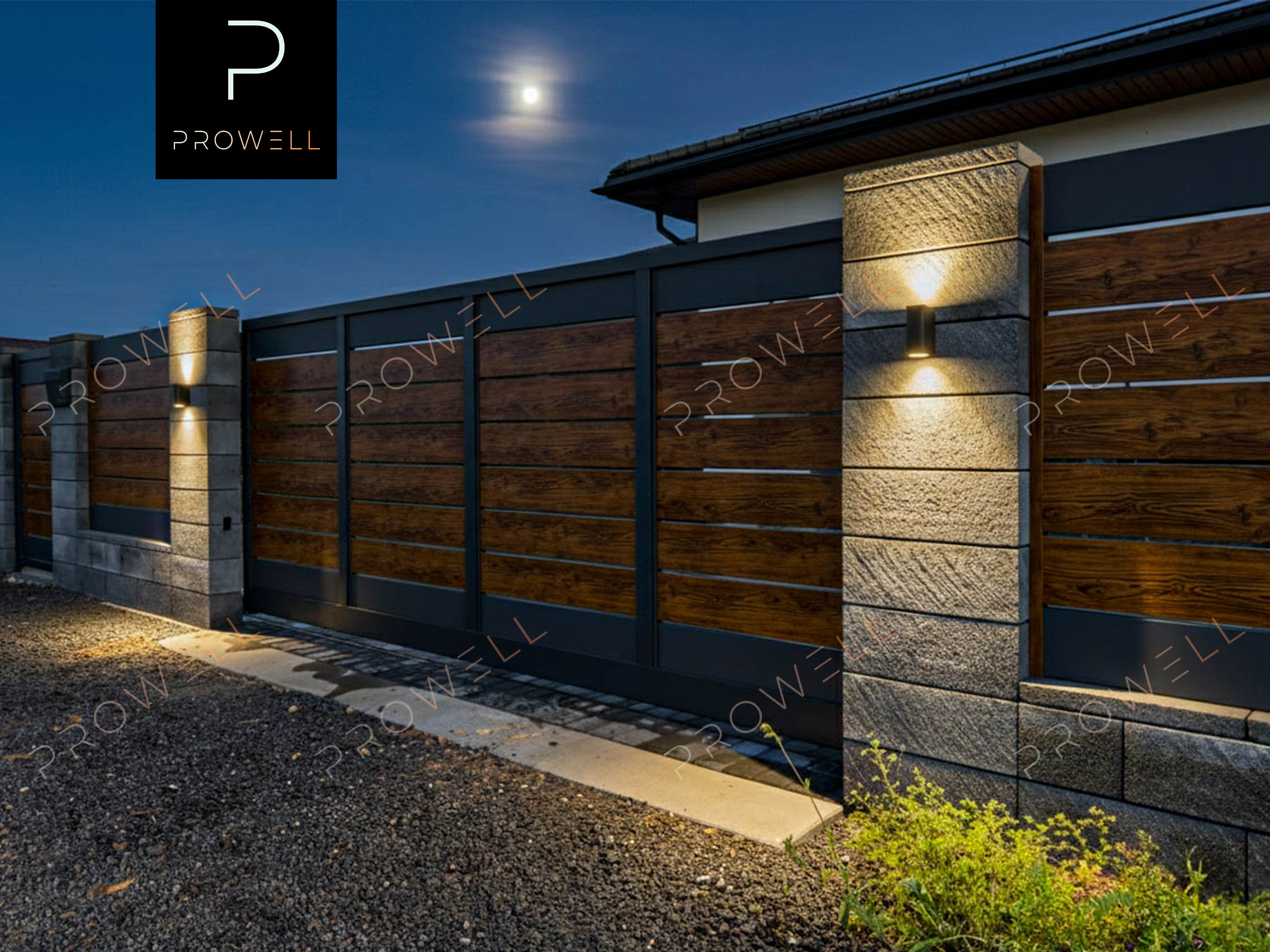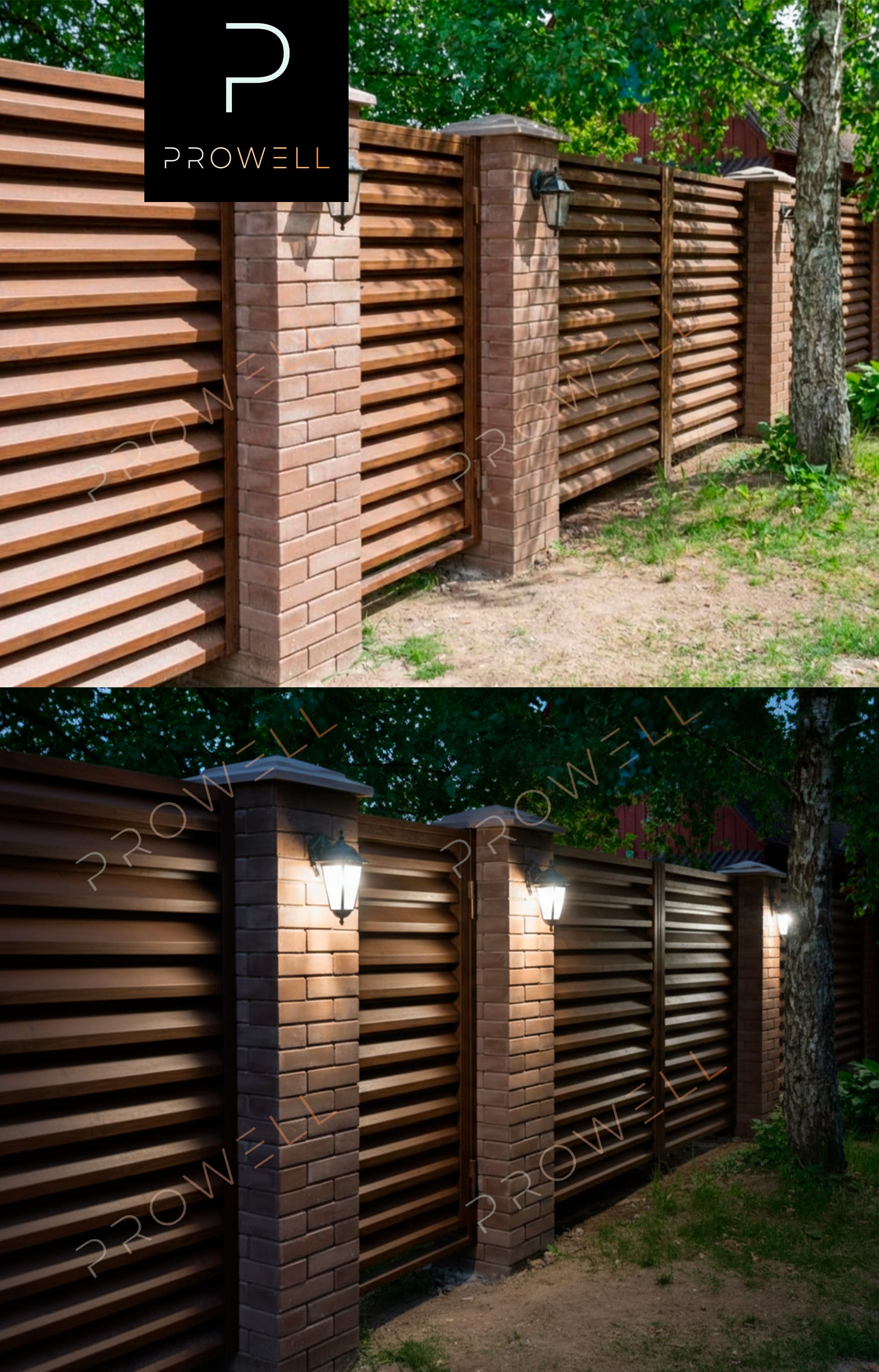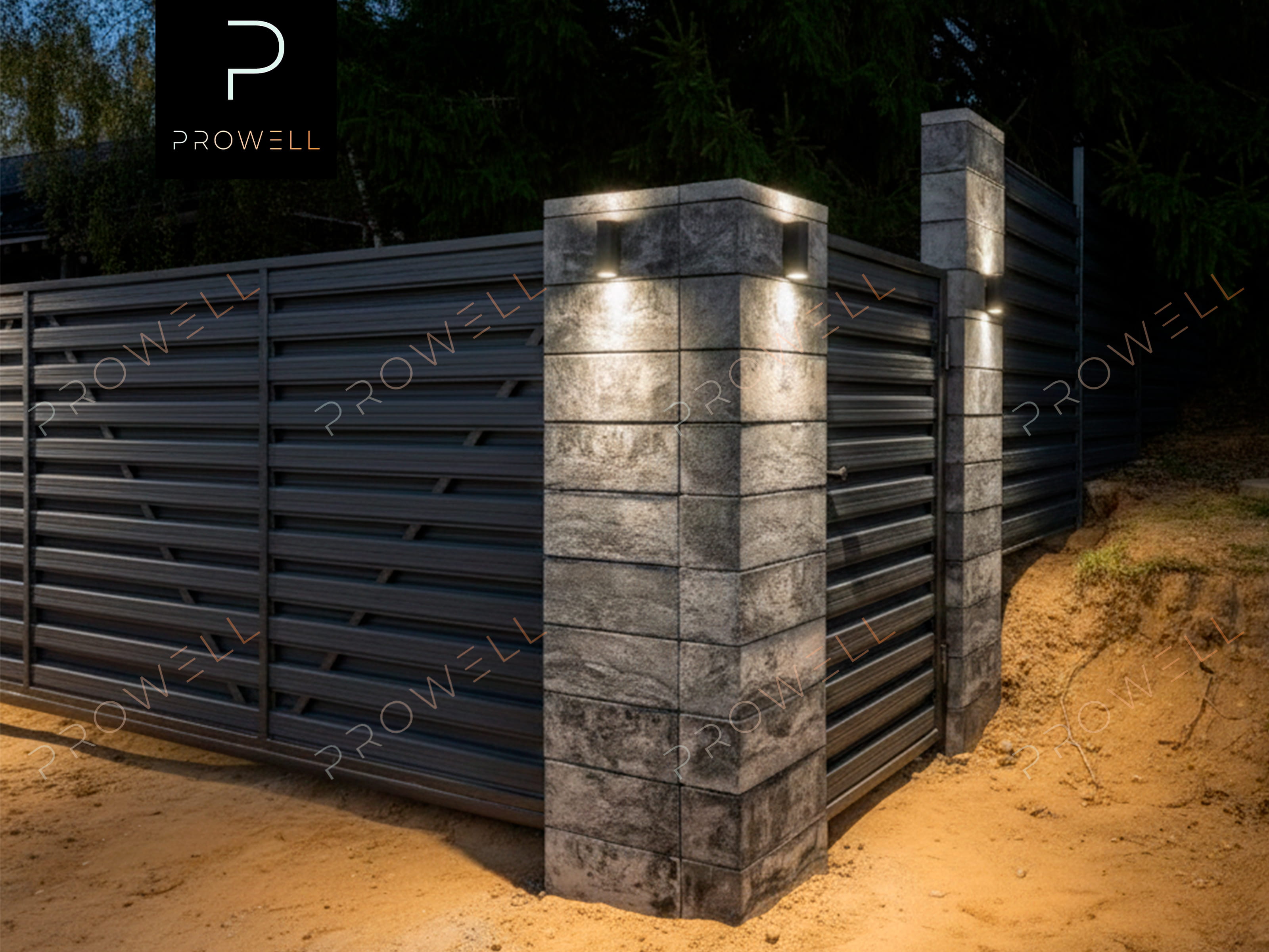 «Современное решение для вашего участка: стильный забор с комбинированной подсветкой. На фото продемонстрирована функциональность системы — днем забор обеспечивает эстетичный внешний вид и приватность, а с наступлением темноты настенные фонари создают уютную атмосферу и обеспечивают безопасность»