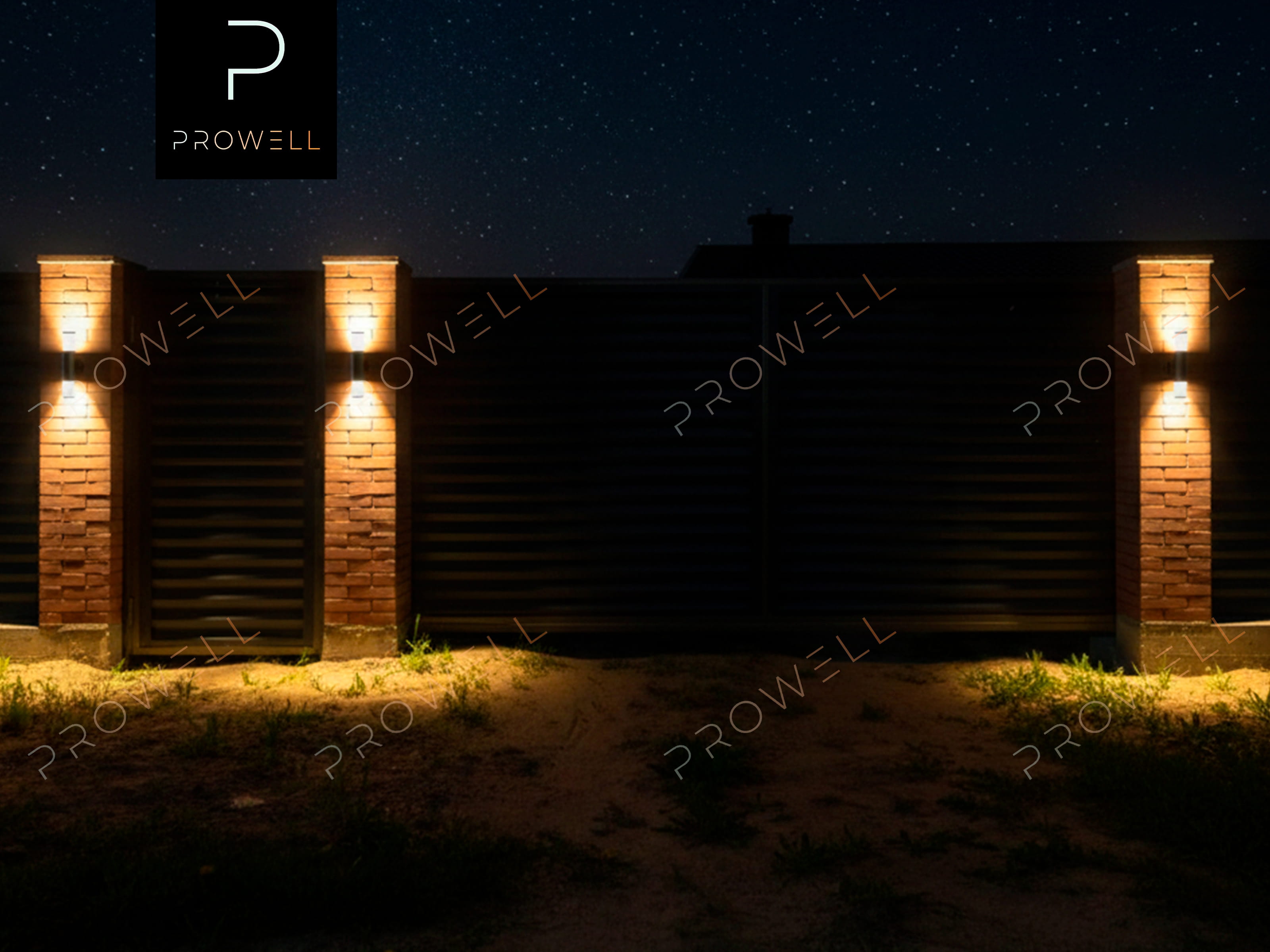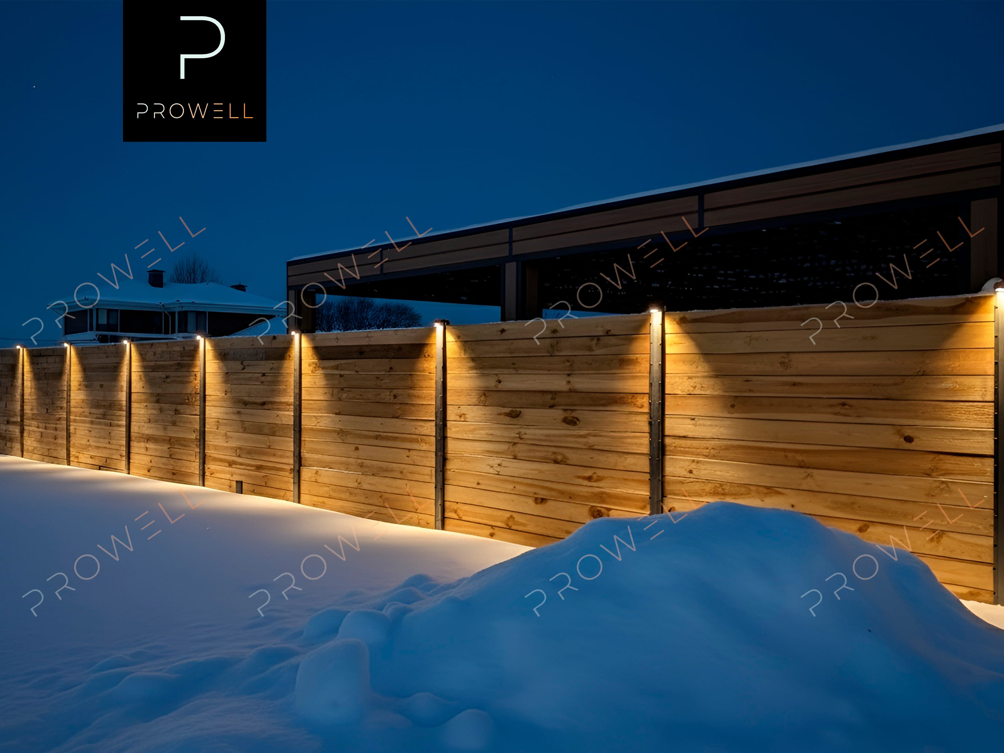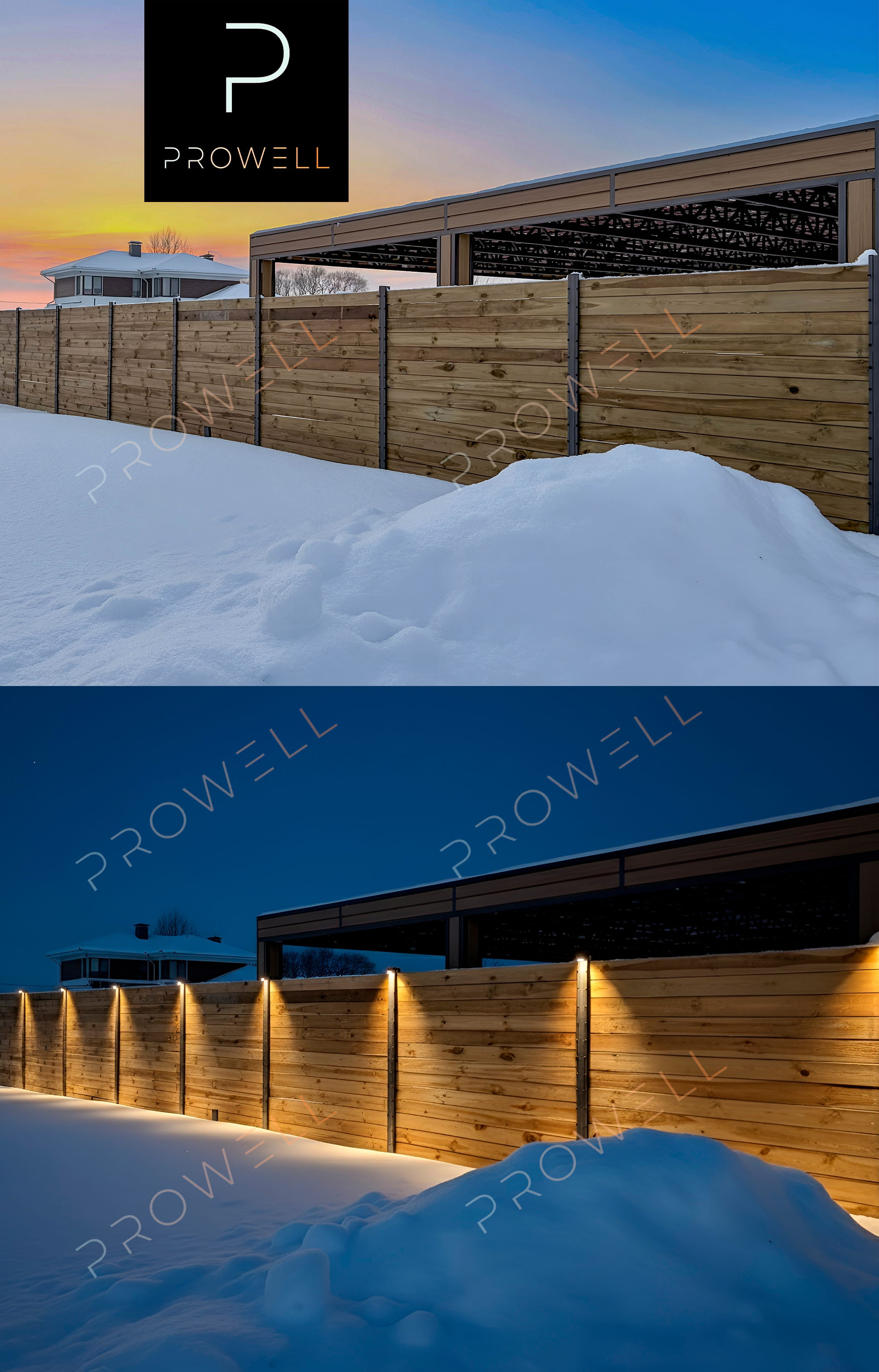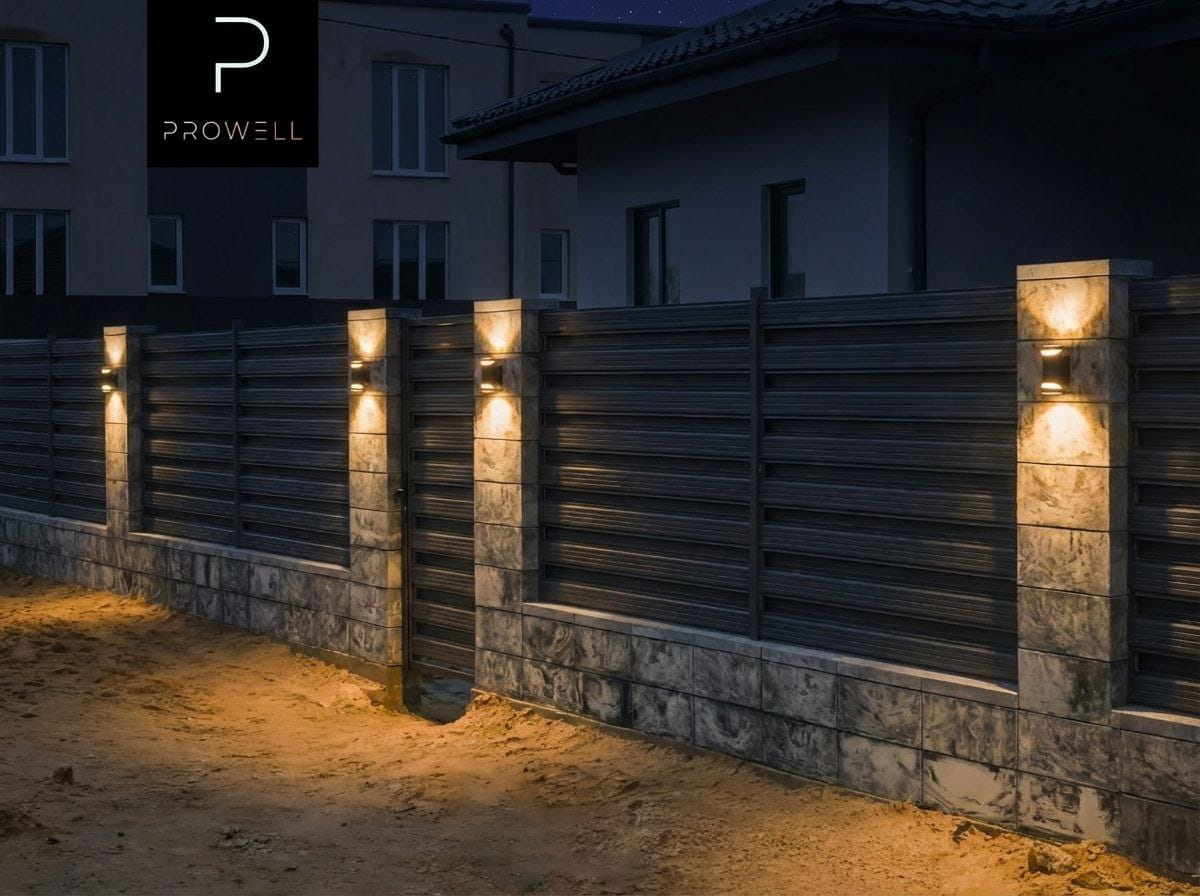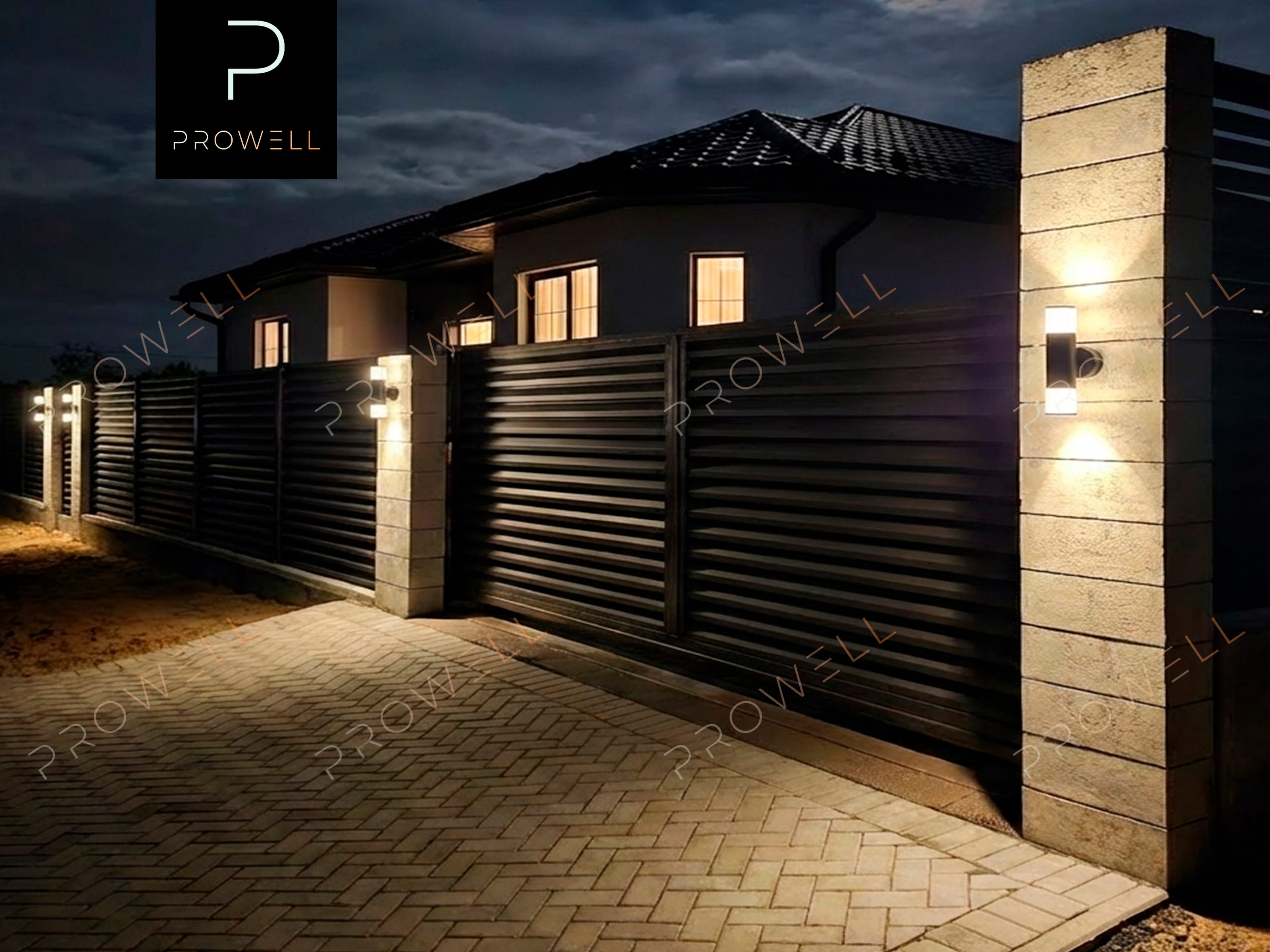 «Современное решение для вашего участка: стильный забор с комбинированной подсветкой. На фото продемонстрирована функциональность системы — днем забор обеспечивает эстетичный внешний вид и приватность, а с наступлением темноты настенные фонари создают уютную атмосферу и обеспечивают безопасность»