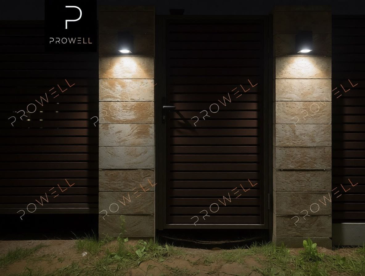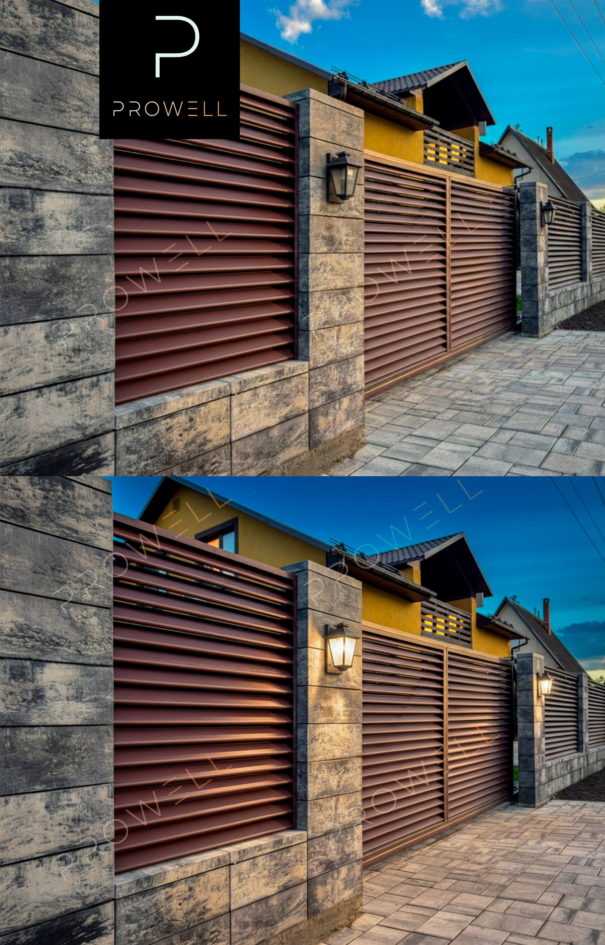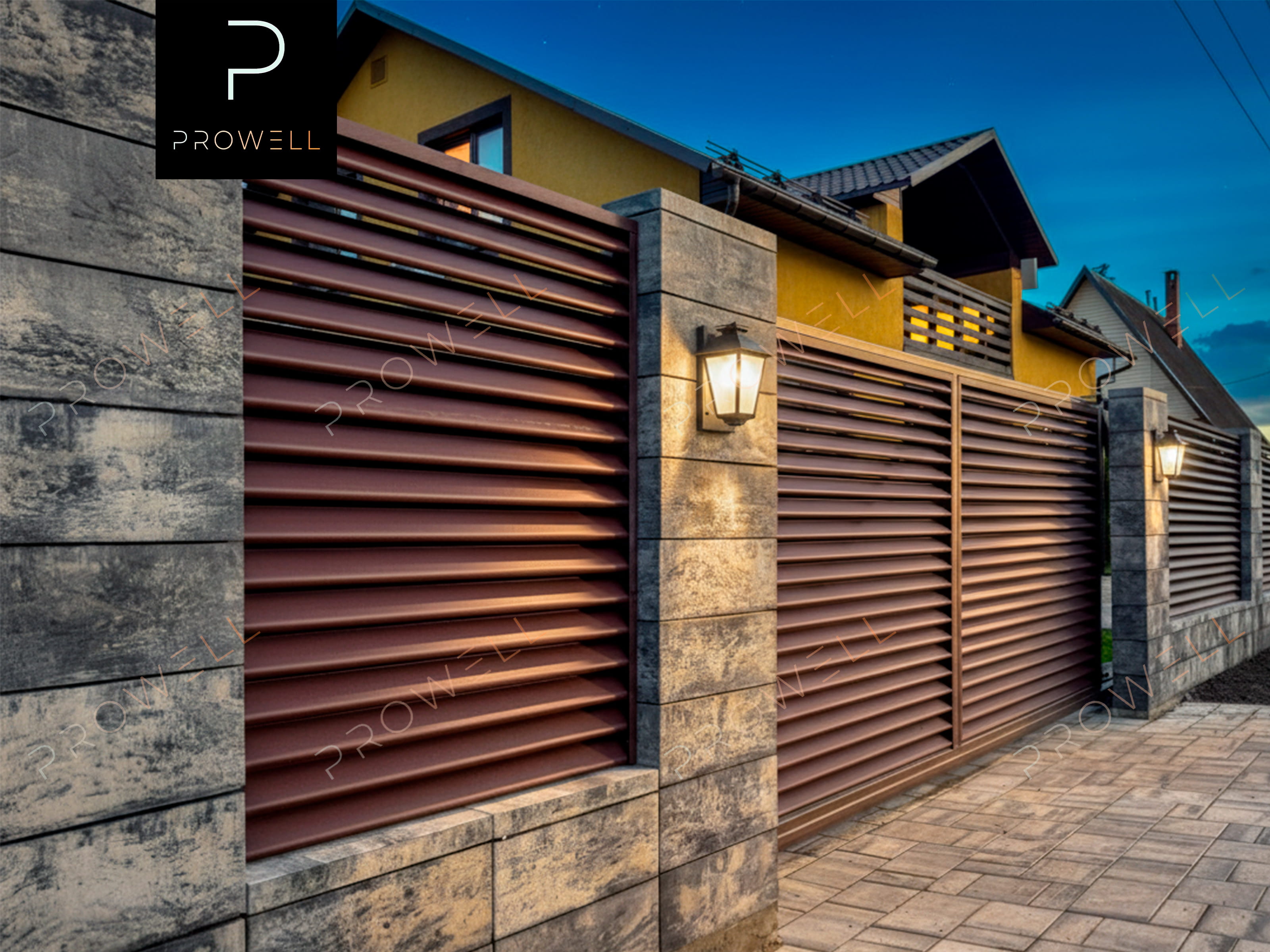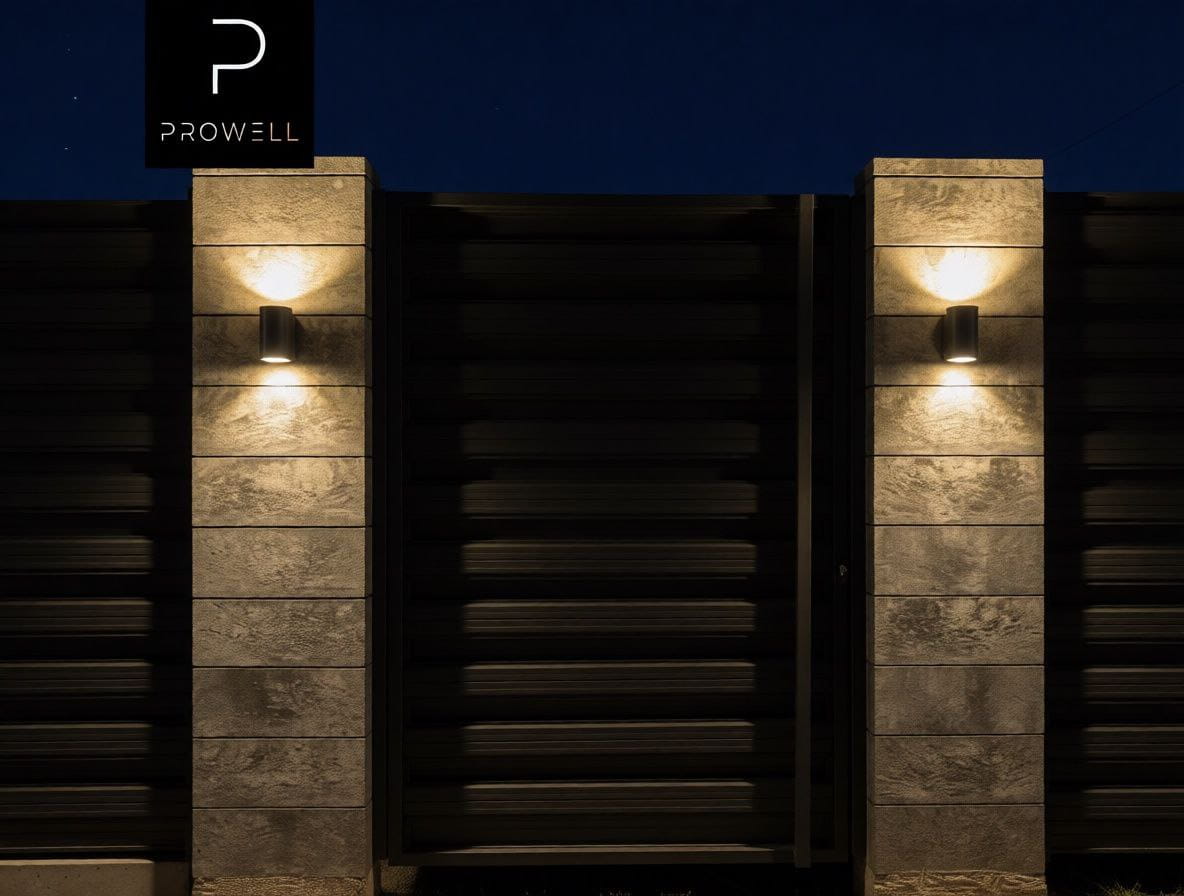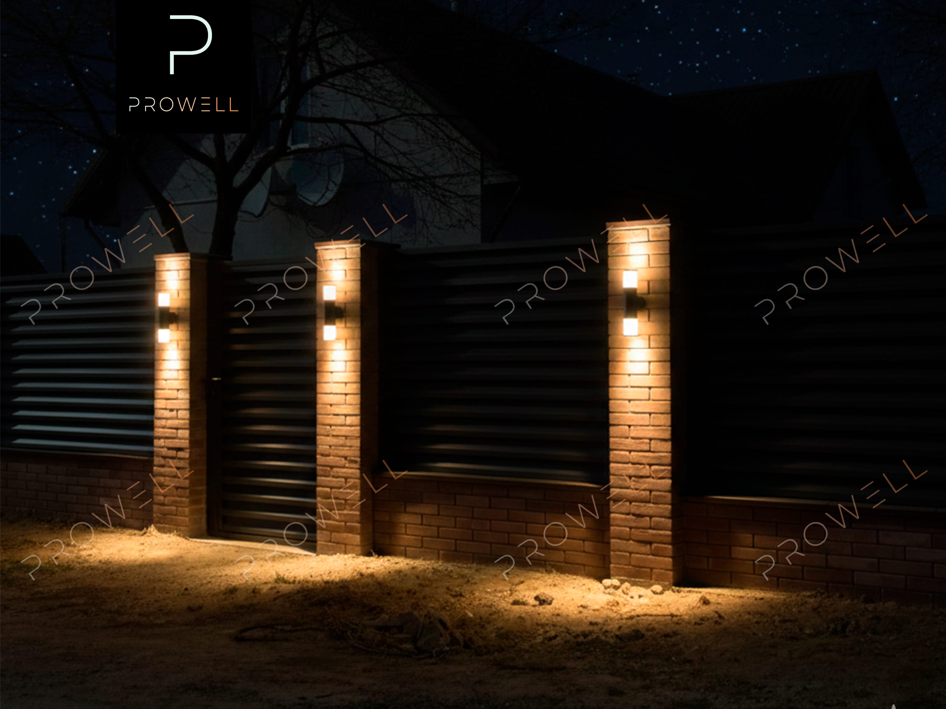 «Современное решение для вашего участка: стильный забор с комбинированной подсветкой. На фото продемонстрирована функциональность системы — днем забор обеспечивает эстетичный внешний вид и приватность, а с наступлением темноты настенные фонари создают уютную атмосферу и обеспечивают безопасность»